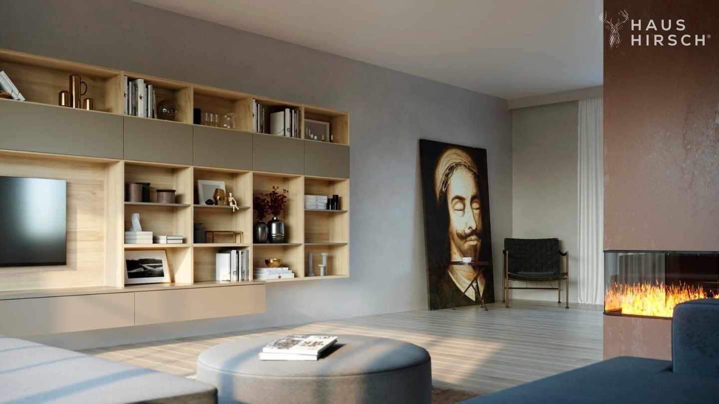Die Bilder der ausgestatteten Wohnräume (farbige Wände, Spiegel, Holzpaneele, Möblierung) sind Vorschläge, wie sich die Wohnungen gestalten lassen und nicht im Preis inkludiert.