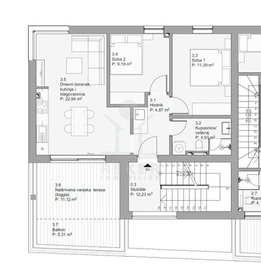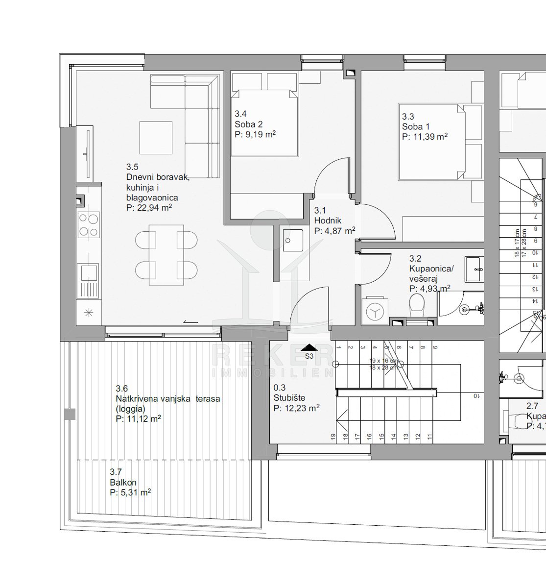 Das Gebäude umfasst vier Wohnungen auf drei Ebenen. Im Erdgeschoss und im ersten Stock entstehen zwei identische Einheiten. Darüber befindet sich das Penthouse mit großzügigem Blick auf das Meer. Eine weitere Wohnung erstreckt sich über zwei Etagen, unten mit Wohnbereich, oben mit Schlafzimmern. Jede Einheit bietet eine eigene Terrasse oder einen Balkon, perfekt, um die Umgebung auf sich wirken zu lassen. Die Architektur überzeugt mit klarer, moderner Formensprache und einem Fokus auf Raumgefühl und Aussicht.