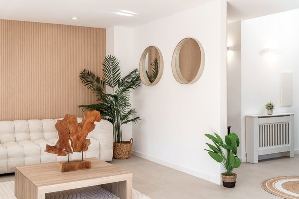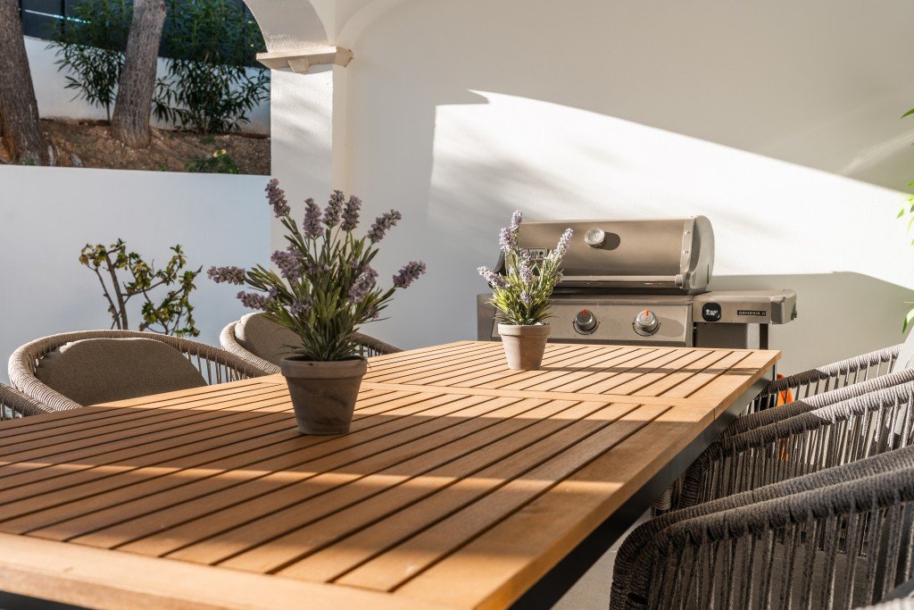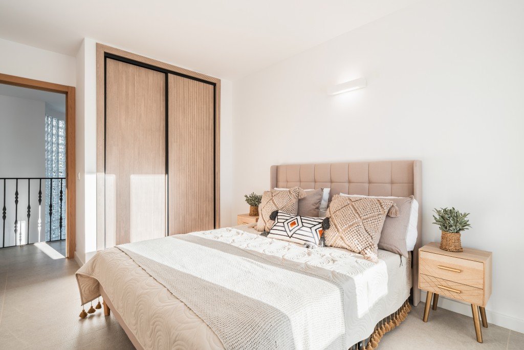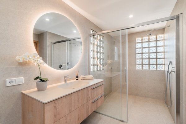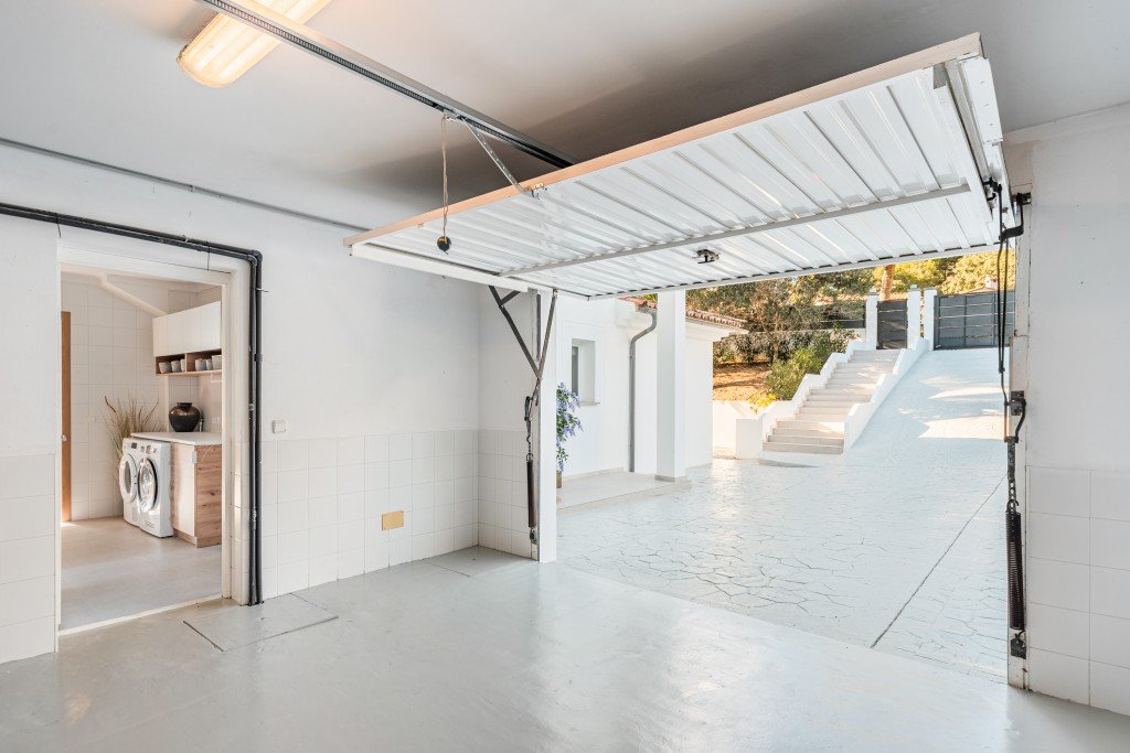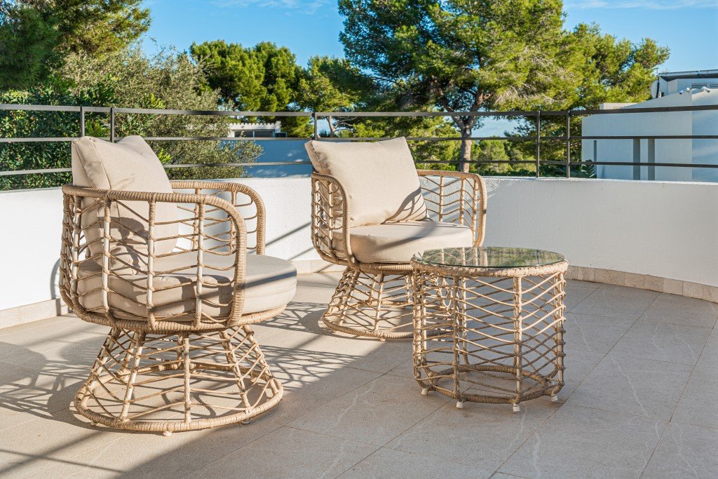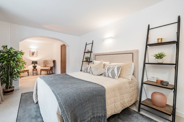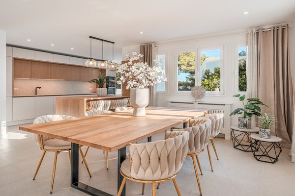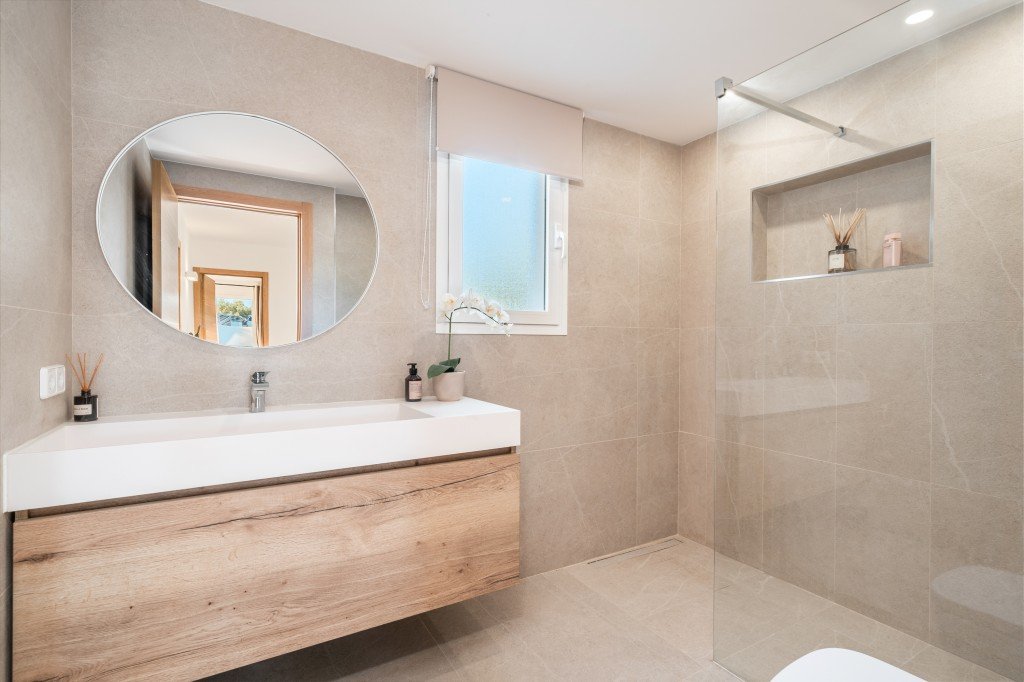 Die Innenräume sind modern und hochwertig ausgestattet. Im Erdgeschoss befinden sich ein offenes Wohn-Esszimmer und eine moderne Nolte-Küche mit Miele-Geräten, die auf eine großzügige Terrasse führt und dazu einlädt, den mallorquinischen Lebensstil im Freien zu genießen.