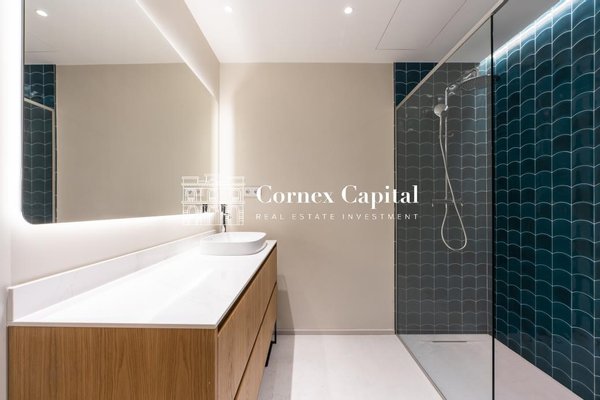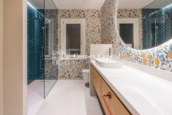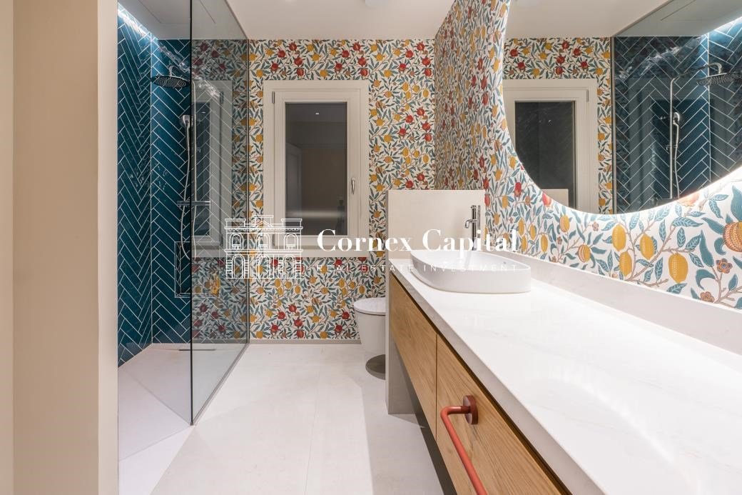Die Wohnung verfügt über drei voll ausgestattete Badezimmer und wurde mit hochwertigen Oberflächen durchgehend gestaltet. Die Terrasse, das wahre Herz des Hauses, wird zu einer perfekten urbanen Oase zum Entspannen, ohne auf Privatsphäre zu verzichten.