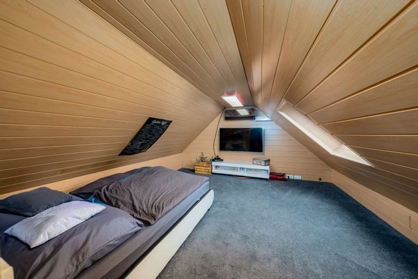 + Dachboden hälftig ausgebaut zur Nutzfläche mit Dämmung und Klimaanlage, hälftig Stauraum