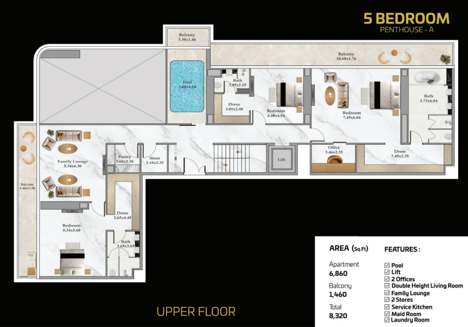 Wenn Sie dieses luxuriöse 5-Schlafzimmer-Penthouse betreten, werden Sie von einer atemberaubenden Reihe von Pools und Wasserspielen begrüßt. Der Infinity-Pool bietet einen atemberaubenden Blick auf die Skyline der Stadt, während der Innenpool eine