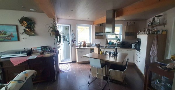 Imposant ist der über 42 Quadratmeter große Küchen- und Wohnbereich der Hauptwohnung. Die großen Fenster bieten einen wunderschönen Blick auf Terrasse und den großen Schwimmteich.
