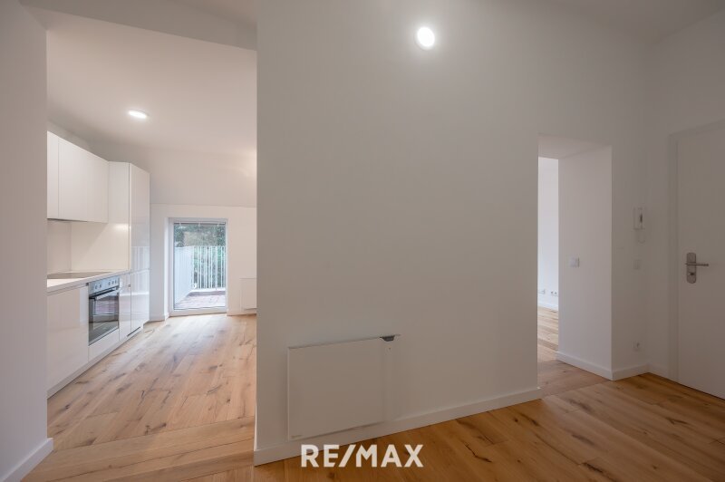 Moderne Terrassenwohnung mit außergewöhnlicher Raumhöhe – Ruhig gelegen, nach hinten gartenseitig ausgerichtet, öffnet sie sich zu einem geschützten, grünen Rückzugsbereich.