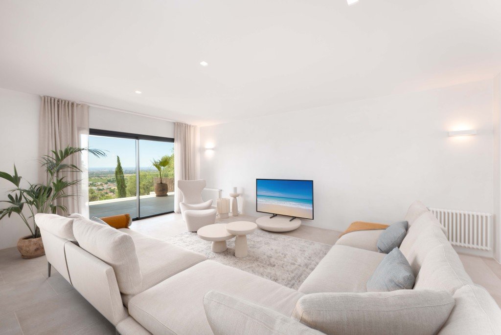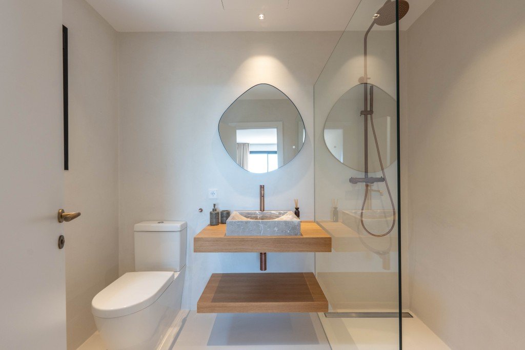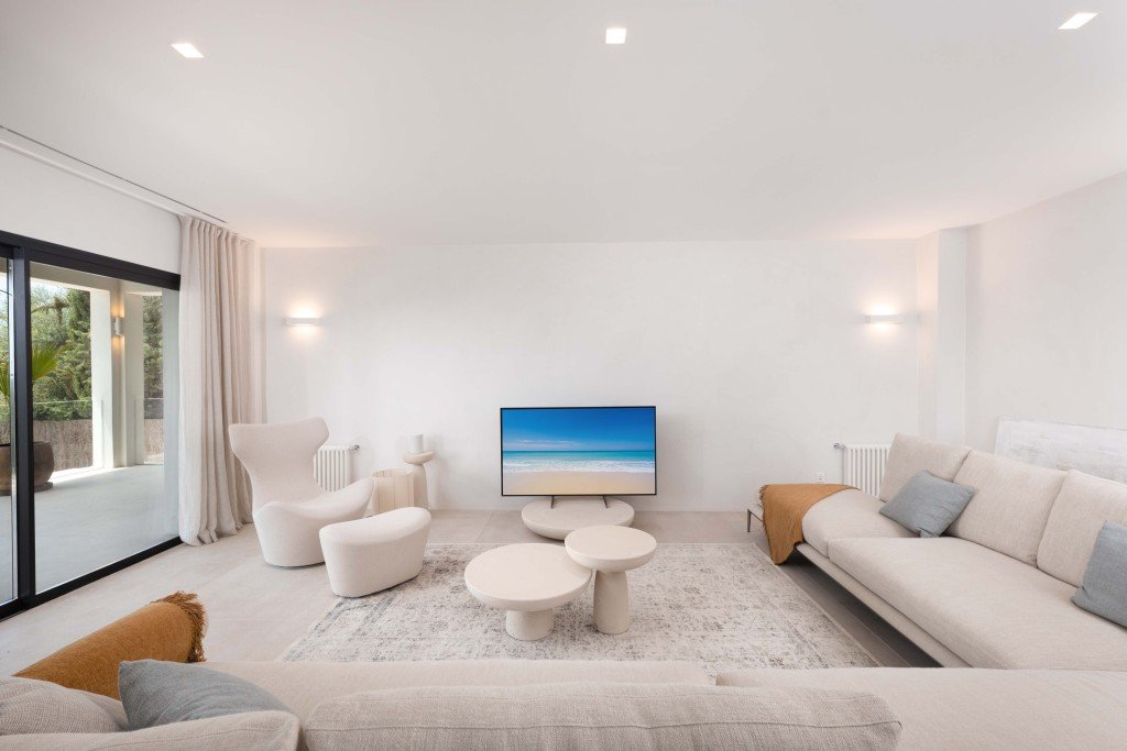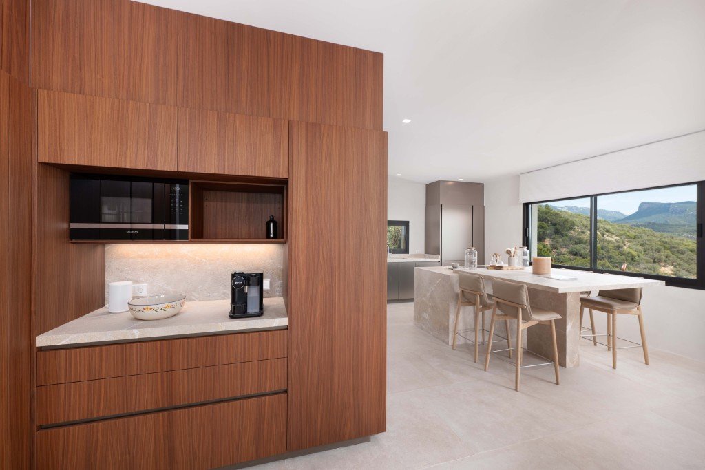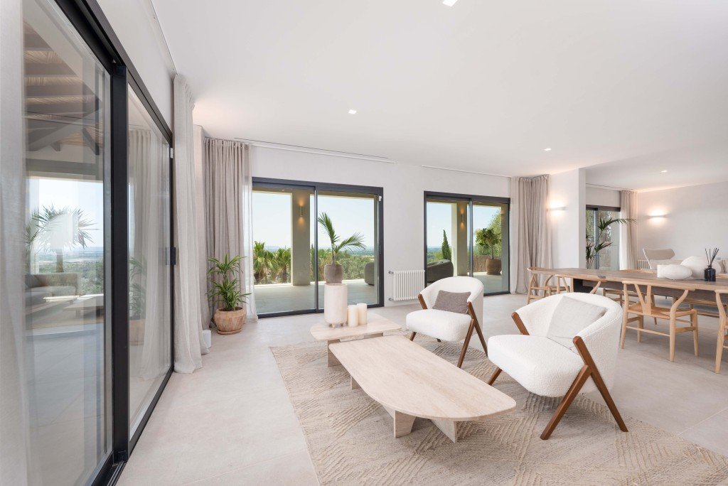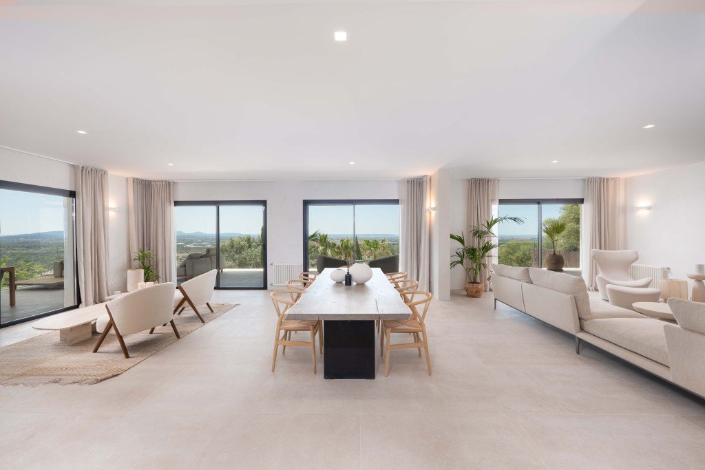 Im Erdgeschoss befinden sich eine voll ausgestattete Küche mit Möbeln von Poliform, ein geräumiges Esszimmer, zwei Wohnzimmer, ein Schlafzimmer mit Bad en Suite und ein Flur mit Zugang zu einem Gäste-WC. Darüber hinaus befinden sich hier der Aufzug und eine Treppe, die das Erdgeschoss, das Untergeschoss und eine ca. 100 m² große Veranda verbindet. Die Möbel in den Wohnzimmern, dem Esszimmer und der Veranda wurden sorgfältig von der renommierten Firma Terraza Balear ausgewählt.
