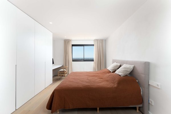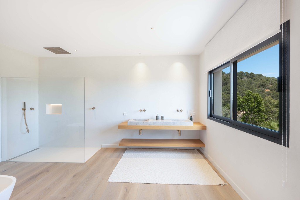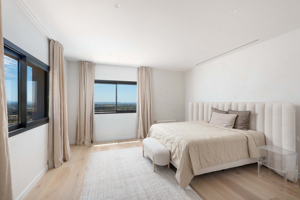 Das Erdgeschoss beherbergt mehrere Schlafzimmer, alle mit spektakulärem Blick auf das Tramuntana-Gebirge und das Meer. Die Parkettböden verleihen den Räumen Wärme und Eleganz.