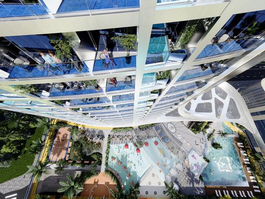 Der Grillplatz, das Freiluftkino, die Restaurants und Einzelhandelsgeschäfte, die Lounge auf dem Dach und die Cabana-Sitzgelegenheiten laden zum geselligen Beisammensein und Essen mit Freunden und Familie ein.