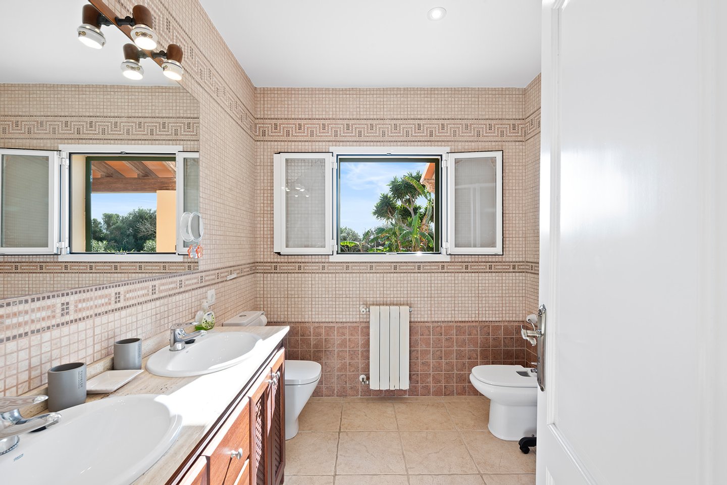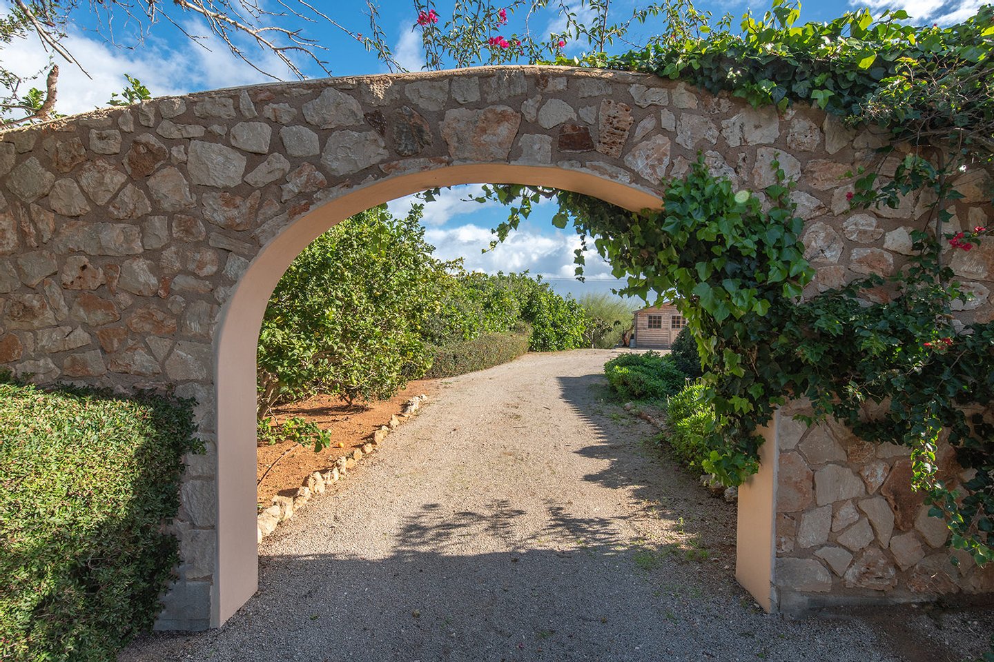 Mit vielen Palmen und In üppigen Grün eingebettet, präsentiert sich diese Finca als charmantes Landhaus. Hier ist traditionelle Architektur harmonisch mit der mediterranen Umgebung verbunden, wozu Natursteinfassaden und Maressteinverkleidungen beitragen.