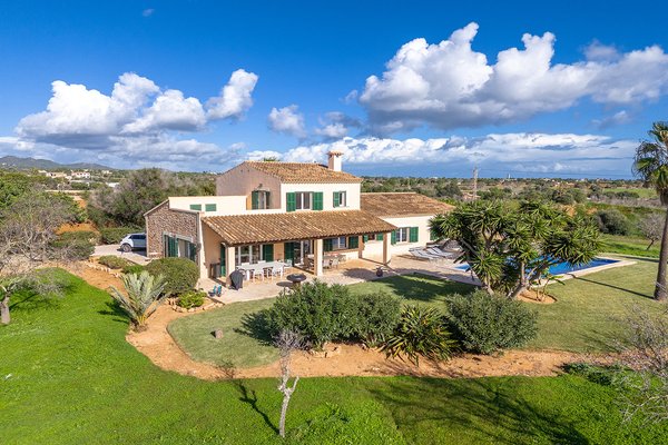 Mit vielen Palmen und In üppigen Grün eingebettet, präsentiert sich diese Finca als charmantes Landhaus. Hier ist traditionelle Architektur harmonisch mit der mediterranen Umgebung verbunden, wozu Natursteinfassaden und Maressteinverkleidungen