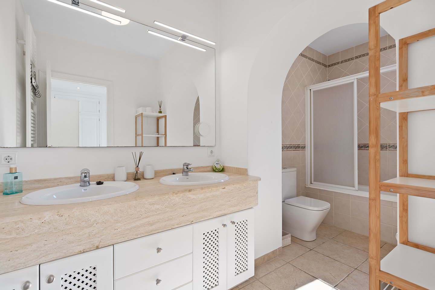 Das Erdgeschoss der Immobilie verfügt über zwei geräumige Schlafzimmer, jeweils mit Bad en suite. Zusätzlich steht ein separates Gästebad zur Verfügung.