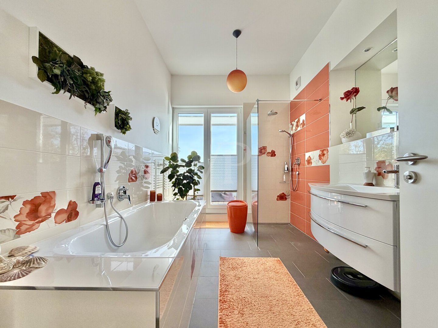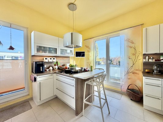 Bereits das Entrée im Dachgeschoss vermittelt ein Gefühl von Großzügigkeit. Hier befindet sich das beeindruckende Wohn- und Esszimmer – ein lichtdurchfluteter Raum, dessen Architektur durch seine offenen Sichtachsen und die umlaufende Terrasse perfekt in Szene gesetzt wird. Auf der vorgelagerten Terrasse genießen Sie unvergleichliche Ausblicke auf die Müggelspree und das lebendige Treiben auf dem Wasser. Weitere Räumlichkeiten sind ein stilvolles, gemütliches Wannen- und Duschbad mit einem großzügigen Waschtisch. Die hochwertige Nolte-Einbauküche ist ein weiteres Highlight. Sie ist mit einer beliebten Kochinsel ausgestattet und neben einem Induktionskochfeld, Backofen, Mikrowelle mit Grillfunktion, Kühl- und Gefrierschrank sowie Geschirrspüler – lädt sie sowohl zum schnellen Frühstück als auch zum anspruchsvollen Kochevent ein. Ein vorgelagerter großzügiger Terrassenplatz ermöglich es, bei schönem Wetter das Essen an der frischen Luft zu genießen.