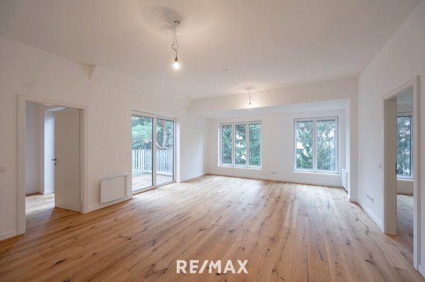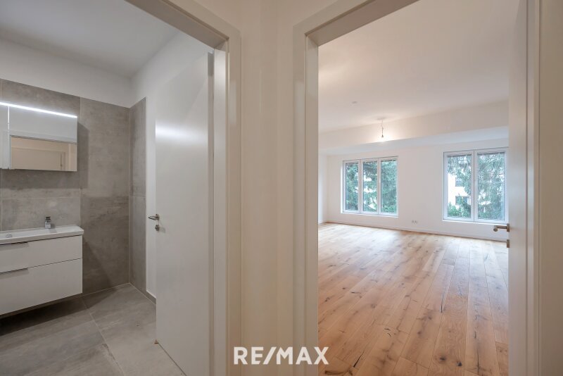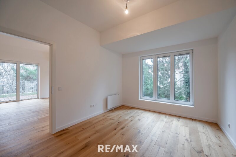 Moderne Terrassenwohnung mit außergewöhnlicher Raumhöhe – Ruhig gelegen, nach hinten gartenseitig ausgerichtet, öffnet sie sich zu einem geschützten, grünen Rückzugsbereich.