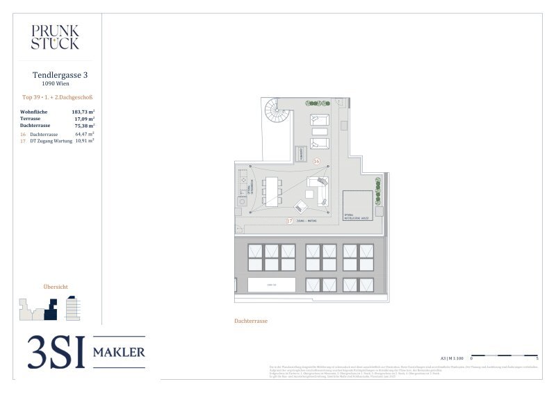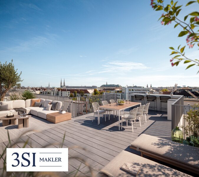 Die fast 75m² große Dachterrasse bietet einen spektakulären Blick über Wien – der perfekte Ort, um den Sonnenuntergang zu beobachten oder entspannte Stunden im Freien zu verbringen.