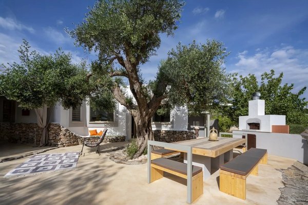 Überdachte Terrasse (~40 m²) mit Lounge- und Essbereich, beschattet von einem majestätischen Olivenbaum