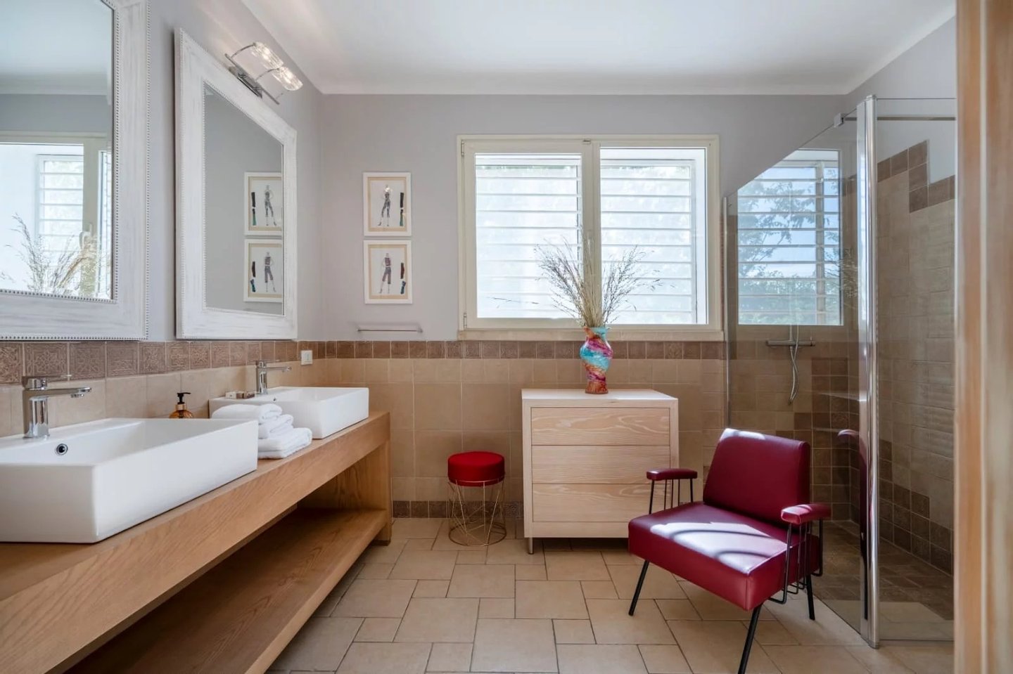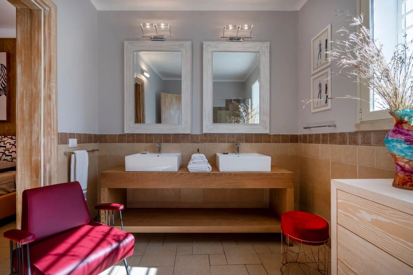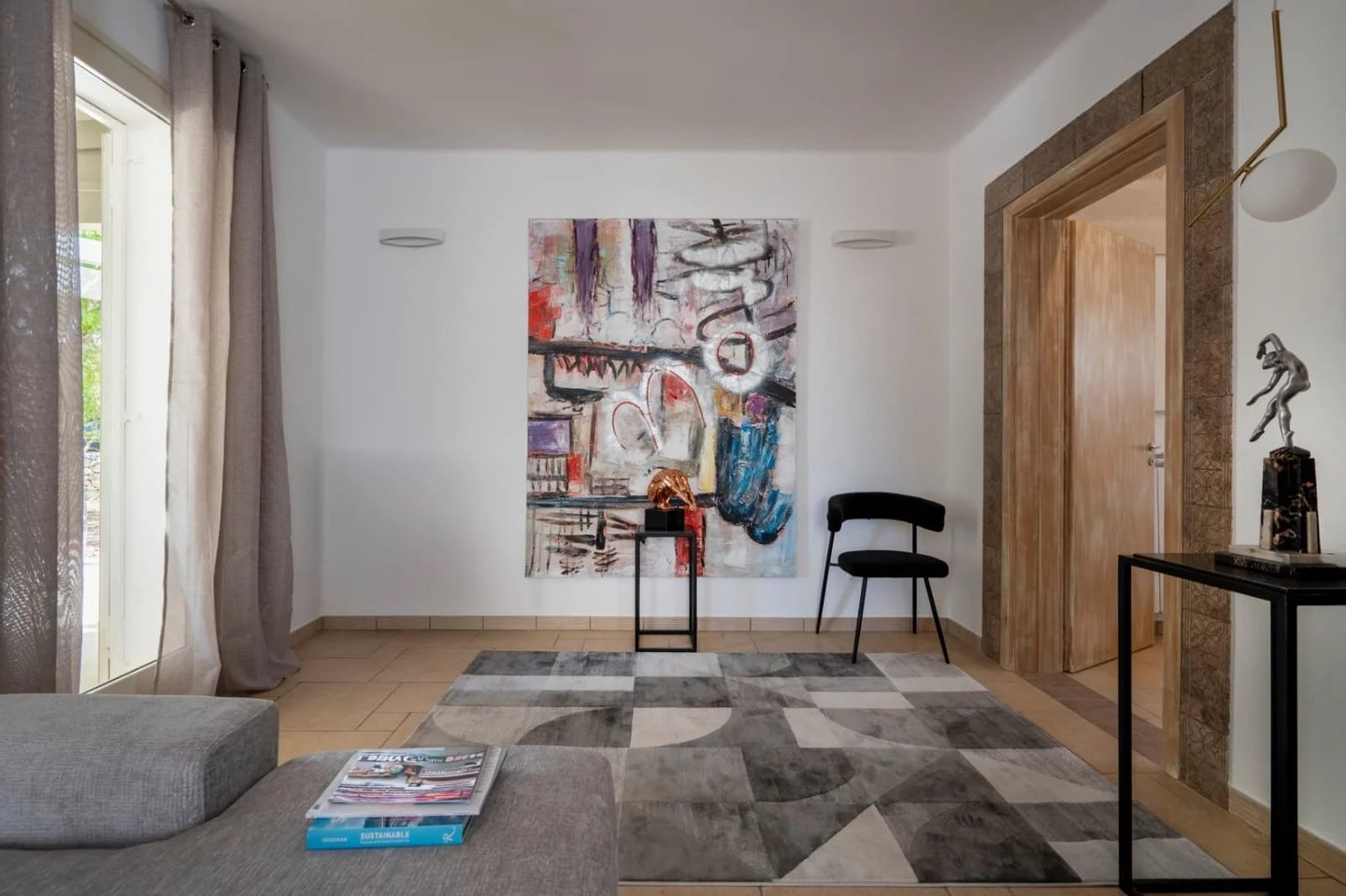 Das Innere der Villa ist mit sorgfältig ausgewählten Kunstwerken ausgestattet: Bronzeskulpturen auf ägyptischem Marmor und Schmiedeeisen, Reproduktionen von Werken Dorazios und Hoppers von Maria Sidoli, zeitgenössische Gemälde, lackierte Vasen aus aller Welt. Jedes Zimmer strahlt Eleganz und feine Exklusivität aus.