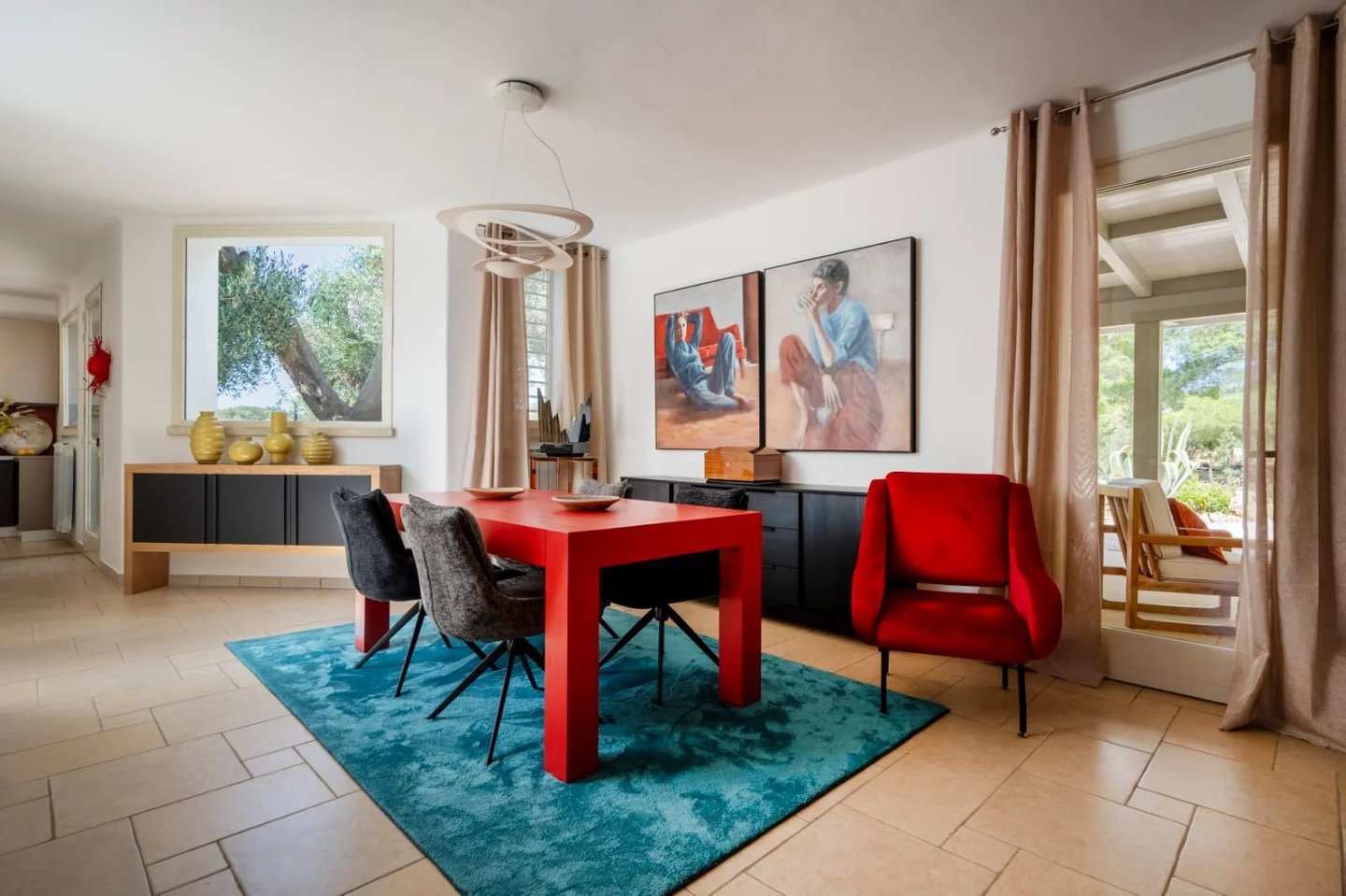 Essbereich im Haus, nahtlos verbunden mit den Außenbereichen