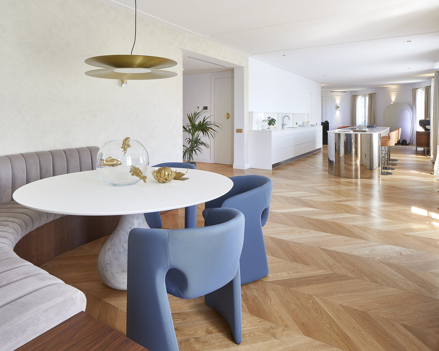 The building’s corner position provides privileged views of the Eixample’s historic architecture and toward the sea, while nine balconies ensure constant luminosity. At night, carefully designed interior lighting transforms the home into an elegant and serene space.