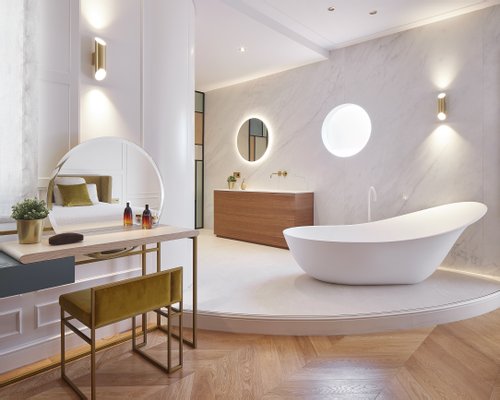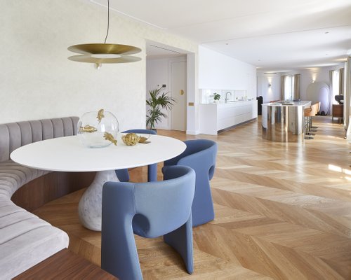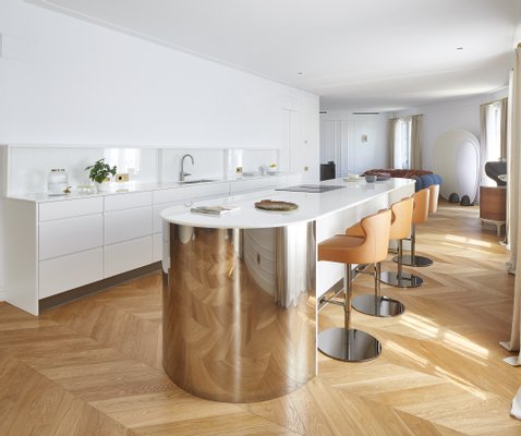 Beim Betreten der Wohnung integriert ein großzügiger und heller offener Bereich nahtlos Wohnzimmer, Esszimmer und Designerküche. Seine sechs Außenbalkone fluten den Tagesraum mit natürlichem Licht und schaffen eine warme und anspruchsvolle Atmosphäre. Vom offenen Atelier führt eine entworfene Treppe zum Kronjuwel des Anwesens: der beeindruckenden oberen Terrasse.