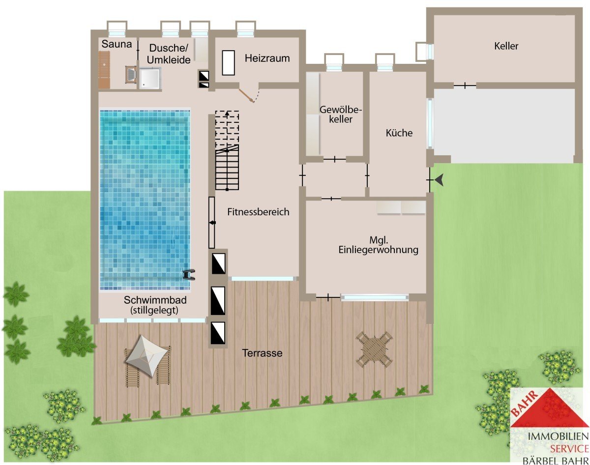 Das Gartengeschoss bietet mit rund 150 m² Nutzfläche ein besonderes Extra: ein ehemaliges Hallenbad, eine Sauna sowie großzügige Abstell- und Hobbyräume. Ob als zukünftiger Wellnessbereich, Fitnesszone, Kreativatelier oder Einliegerwohnung – hier sind Ihrer Fantasie kaum Grenzen gesetzt.