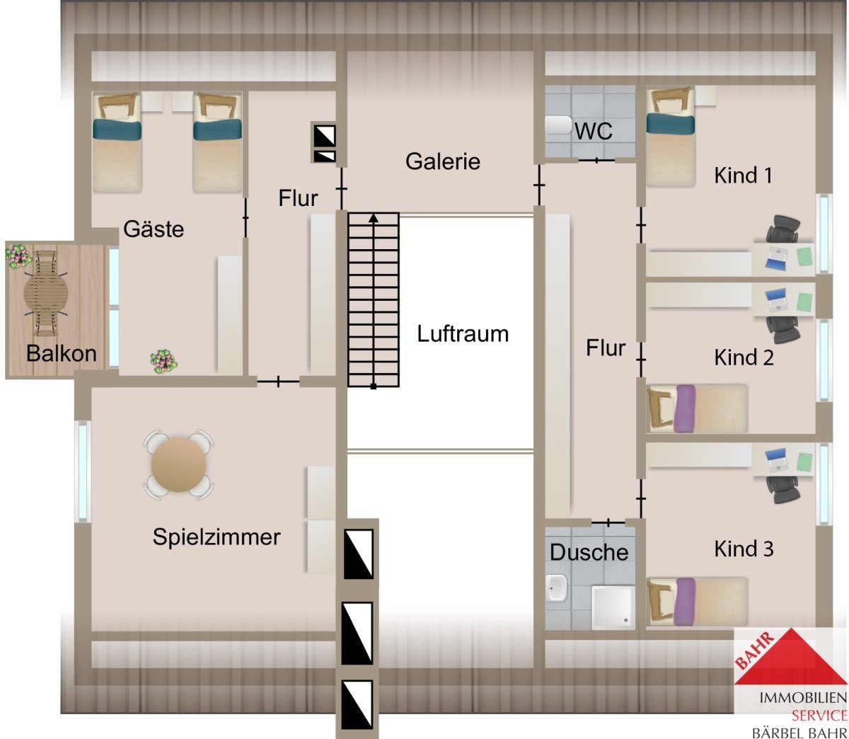Die ca. 245 m² Wohnfläche verteilen sich auf insgesamt 8 Zimmer. Im Dachgeschoss erwartet Sie ein durchdachtes Raumangebot mit drei Kinderzimmern, einem Spielzimmer und einem Gästezimmer – ideal für Familien mit Platzbedarf, häufigen Besuch oder die Kombination aus Wohnen, Arbeiten und Rückzug.