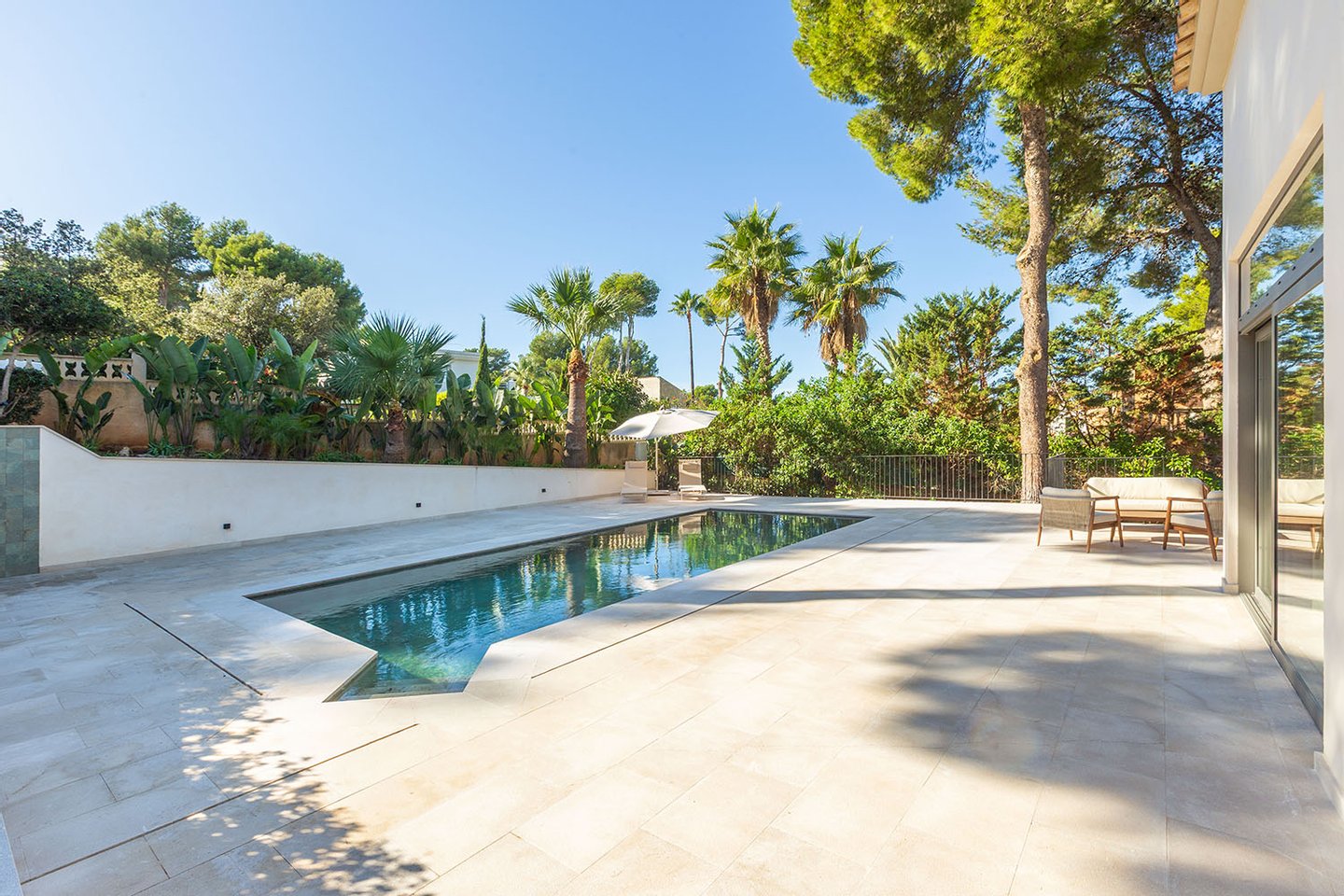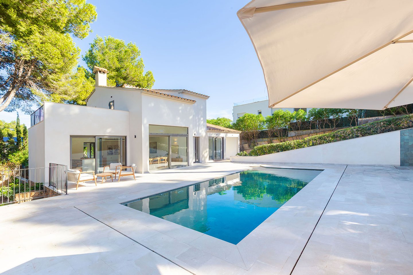 Die im Jahr 2025 einer umfassenden Kernsanierung unterzogene Villa präsentiert sich heute als hochwertige Immobilie, die in sämtlichen Bau- und Ausstattungsdetails modernsten Anforderungen entspricht. Sie liegt in einer exklusiven, ausgesprochen ruhigen Villenurbanisation zwischen den renommierten Golfplätzen von Santa Ponsa und der Küste. Zwei Yachthäfen, mehrere Badebuchten und weitläufige Strände sowie vielfältige Freizeit- und Sporteinrichtungen sind in wenigen Minuten erreichbar. Auch das lebendige Ortszentrum mit einer gut ausgebauten Infrastruktur befindet sich nur eine kurze Autofahrt entfernt. Die Inselhauptstadt Palma liegt etwa 20 Kilometer entfernt und ermöglicht eine schnelle Verbindung zu kulturellen Angeboten, Einkaufsmöglichkeiten und dem internationalen Flughafen.