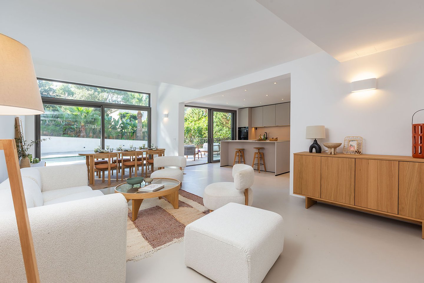 Der offen gestaltete Hauptwohnbereich verbindet Wohnen, Essen und Kochen zu einem repräsentativen Zentrum des Hauses. Die vollausgestattete Designerküche fügt sich stilvoll in das Gesamtbild ein. Edle Natursteinböden unterstreichen den eleganten, zeitlosen Charakter des Interieurs und vermitteln ein Gefühl von Wertigkeit.
