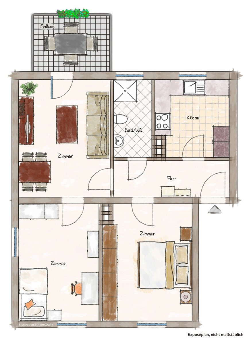 In einem gepflegten Wohnhaus erwartet Sie diese vollständig erneuerte Wohnung. Die Lage im Hochparterre macht viele Wege einfach. Sie betreten die Wohnung ohne große Anstrengung und ohne Treppenläufe, was den Alltag spürbar erleichtert – besonders, wenn man Einkäufe trägt oder einfach schnell nach Hause möchte. Auf rund 59 Quadratmetern finden Sie drei klar geschnittene Zimmer und einen Balkon mit Morgensonne. Alle Räume wurden vollständig renoviert – inklusive Böden, Wänden und Bad.