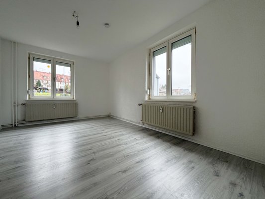 + Wohnzimmer: Ein gut proportionierter Raum mit gleichmäßigem Tageslicht, pflegeleichtem Vinylboden und direktem Zugang zum Ostbalkon – ideal für eine funktionale Möblierung und einen fließenden Übergang ins Freie