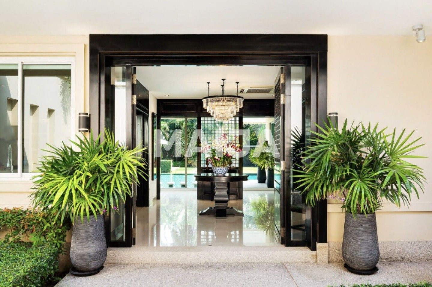 Genießen Sie die Bequemlichkeit, in der Nähe erstklassiger Annehmlichkeiten zu sein, darunter die International School, nur 5 km entfernt, und das belebte Einkaufszentrum Terminal 21, 20 km entfernt. Für Pferdeliebhaber bieten die nahegelegenen Reitställe ein einzigartiges Erlebnis. Mit dem Bangkok International Airport nur 110 km entfernt ist diese Villa die perfekte Ausgangsbasis für die Erkundung der Region.
