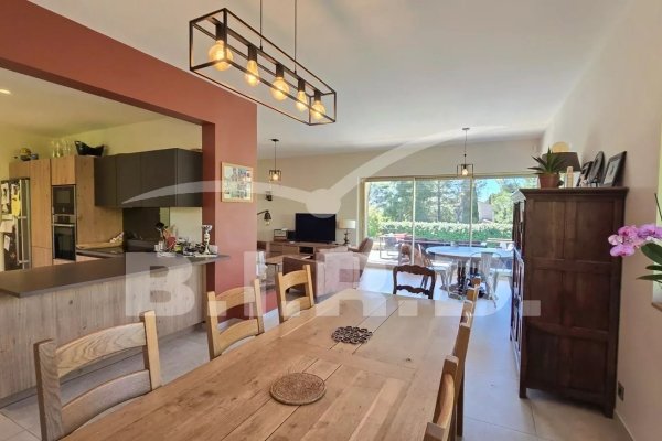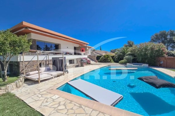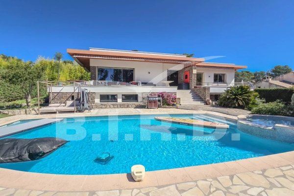 BOULOURIS, 3mn driving from the sea and shops, discover without delay this Californian villa from the 60s, designed by the architect Guy Giger, giving substance to modern lines, overhangs and a refined facade. Recently renovated, it offers 270 m² of living space with bright, air-conditioned volumes, a reception area of ??60 m² with semi-open kitchen, dominant terrace of 40 m² with sea views, a master bedroom of 37 m² with dressing room, bathroom, toilet. On the garden level, 5 comfortable bedrooms, 3 shower rooms, 4 toilets, games room, laundry room, 31m² garage. Rooftop solarium of 60 m². Outside, swimming pool with infinity spa surrounded by a 1220m² landscaped garden.