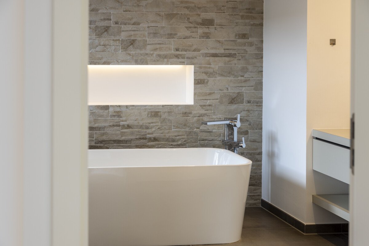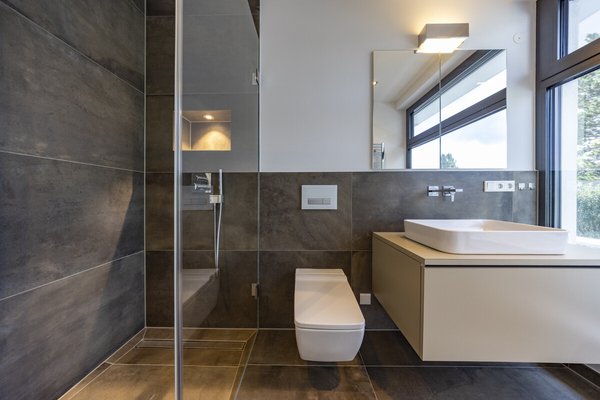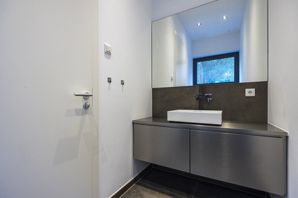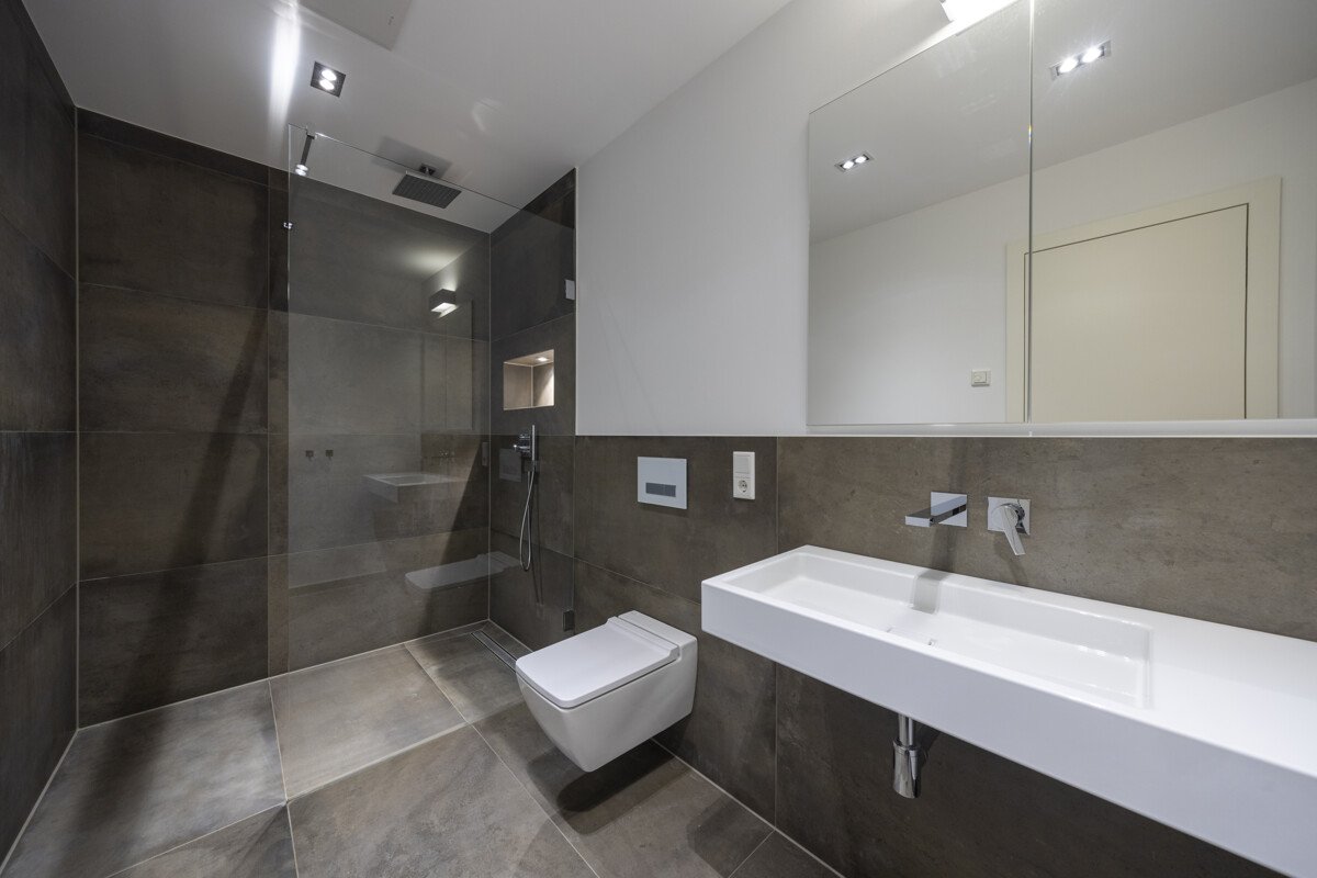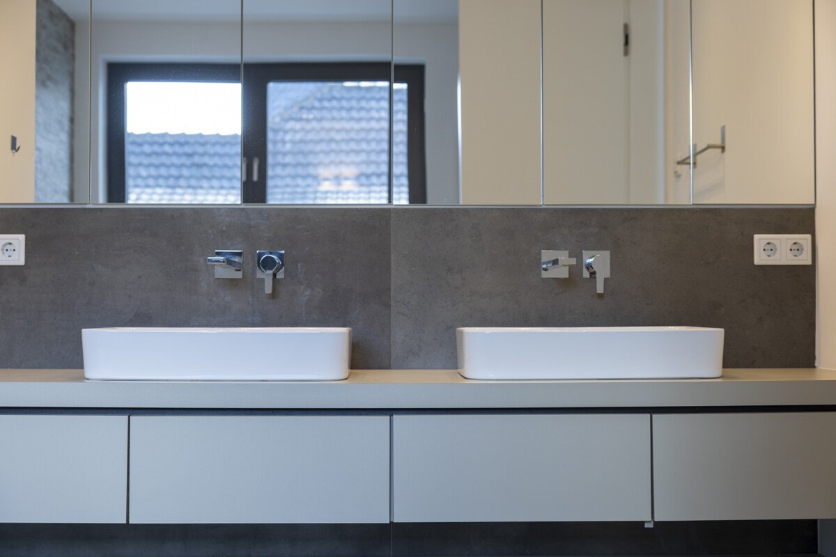 - Maßgefertigte, flächenbündige Spiegelschränke in den Bädern; wandfüllende Spiegelfläche im Gäste-WC