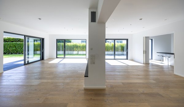 Bereits beim Betreten des Hauses eröffnet sich eine eindrucksvolle Sichtachse vom Eingangsbereich bis in den Garten. Das Erdgeschoss mit rund 186,5 m² Wohnfläche empfängt den Besucher mit einer hellen Diele und ca. 3 m hohen Decken. Der großzügige Wohnbereich von ca. 60 m² geht nahtlos in den etwa 34 m² großen Essbereich über. Raumhohe Fensterfronten und Schiebetüren verbinden das Innere mit zwei großzügigen Terrassen von zusammen über 70 m² – die Grenzen zwischen Innen- und Außenraum verschwimmen auf stilvolle Weise. Die überdachte Terrasse zum Garten bietet ausreichend Platz für eine Lounge-Möblierung, während die sonnige Südterrasse an Küche und Essbereich einen idealen Ort für gesellige Barbecues darstellt. Der weitläufige, kaum einsehbare Garten bietet zudem ausreichend Fläche für einen Außenpool.