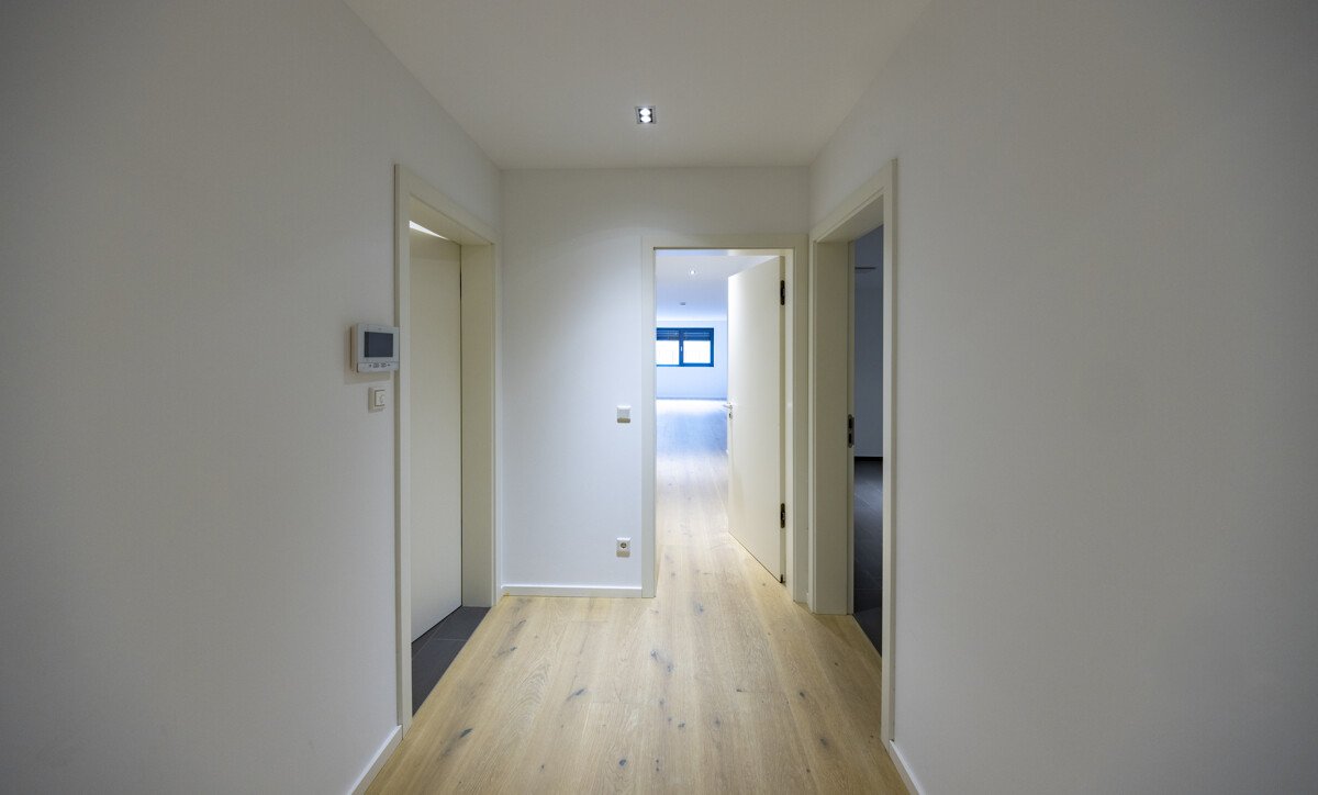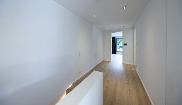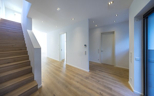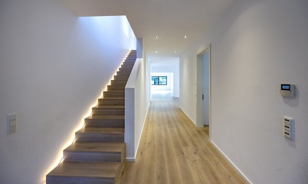 - Integrierte LED-Einbaustrahler im Deckenbereich, LED-Lichtleiste entlang der Treppe ins OG, LED-Wandleuchten ins UG