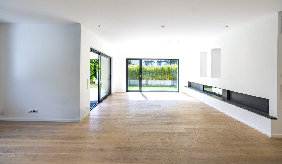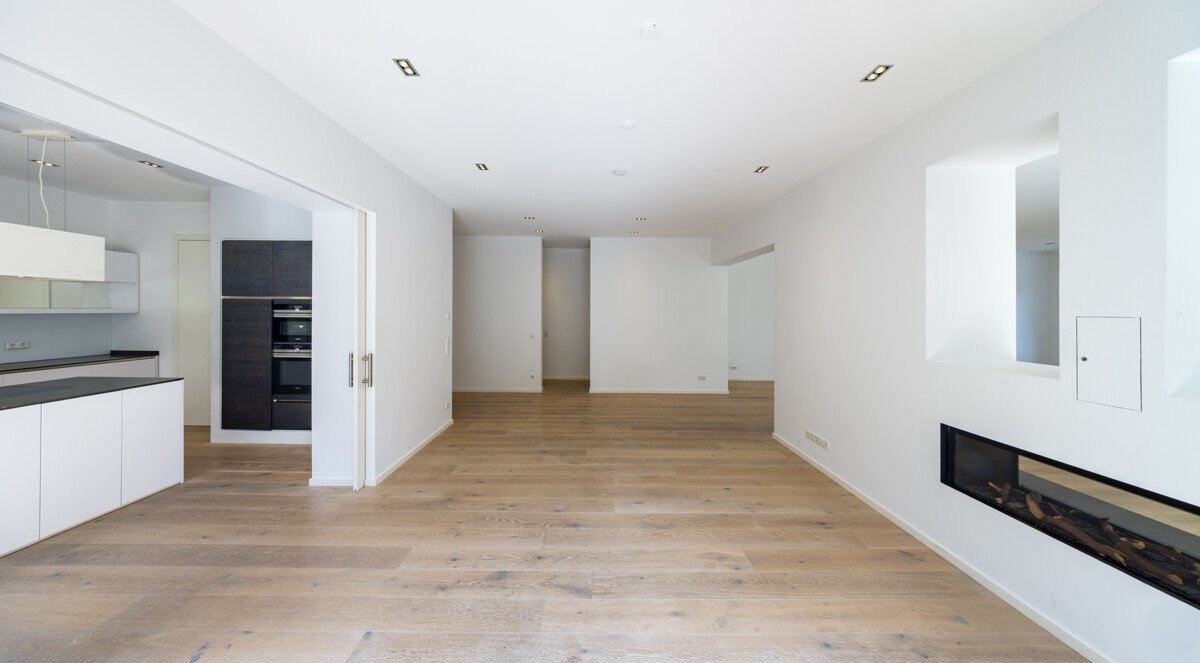 Die exklusive Einbauküche von Bulthaup fügt sich harmonisch in den Grundriss ein und kann durch raumhohe Schiebetüren vom Wohnbereich getrennt werden. Ein wandintegrierter Gaskamin mit ca. 1,60 m breiter Glasfront dient als stilvoller Raumteiler zwischen Wohn- und Essbereich. Funktionale Ergänzungen wie ein Gäste-WC, eine Garderobe sowie ein durchdacht geplanter Hauswirtschaftsraum mit direktem Zugang zur Garage und einem separaten Nebeneingang sorgen für hohen Wohnkomfort. Die elegante Treppe aus Parkett in Blockstufenbauweise mit integrierter LED-Lichtleiste verbindet das Erdgeschoss stimmig mit dem Obergeschoss.