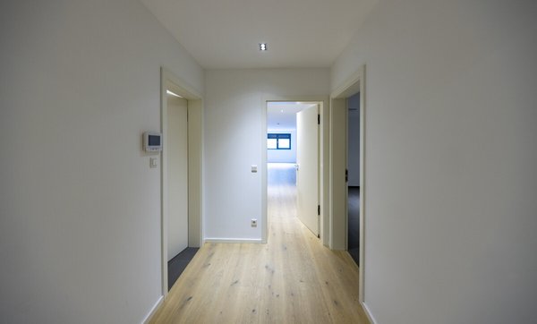 - Weiß geölte Eichen-Dielenböden kombiniert mit großformatigem Feinsteinzeug