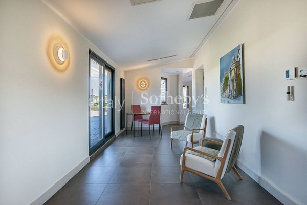 Auf der ersten Ebene führt ein eleganter Eingangsbereich zu einem hellen Wohnzimmer mit hochwertigen Ausführungen. Der Schlafbereich umfasst zwei großzügige Schlafzimmer, ein ruhiges Arbeitszimmer und drei fein ausgestattete Badezimmer. Abgerundet wird diese Etage durch ein Personalzimmer mit eigenem Bad, das sich harmonisch in die Raumaufteilung einfügt. Die zweite Ebene beherbergt eine prachtvolle Wohnküche, einen stilvollen Essbereich und ein großzügiges Doppelwohnzimmer, ideal für gesellige Momente und Unterhaltung.