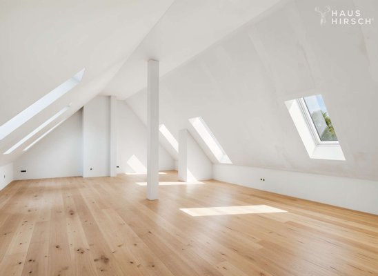 Über eine maßgefertigte Eichenholztreppe gelangen Sie in den ausgebauten Dachspitz (ca. 70,90 m² Rohfläche), dessen Raumhöhe und Gaubenlicht zum Träumen einlädt.