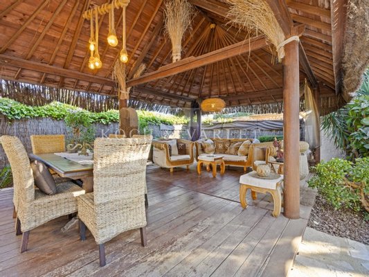 Dans le jardin, vous trouverez plusieurs espaces extérieurs attrayants, dont une maison balinaise où vous pourrez vous détendre à l'ombre, une piscine pour vous rafraîchir lors des journées chaudes et plusieurs terrasses autour de la maison - parfaites pour les longues soirées d'été entre amis et en famille.