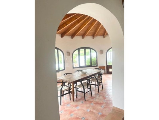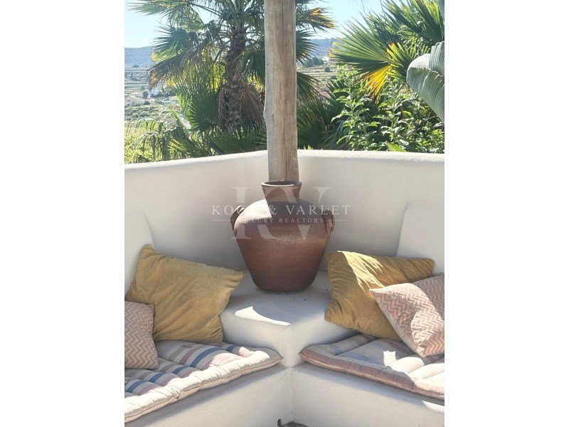 La piscine légalisée forme la pièce maîtresse rayonnante du vaste terrain, entourée de jardins luxuriants avec des palmiers, des plantes méditerranéennes et des arbres fruitiers. Juste à côté de la piscine se trouve un joli coin de détente de style Ibiza - votre retraite privée pour les longues soirées d'été, les siestes ou les boissons confortables.