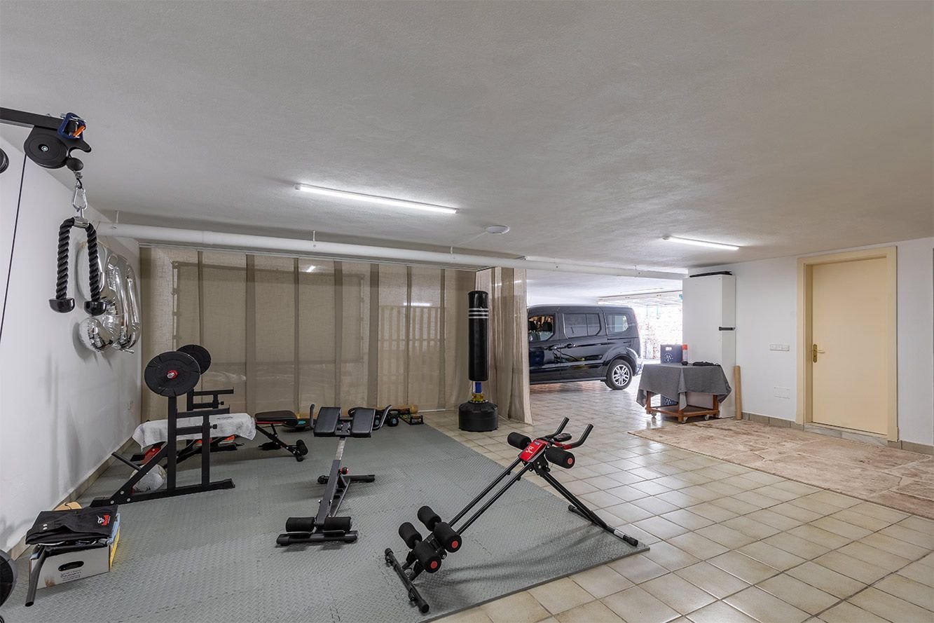 Das Untergeschoss (ca. 170 m²) umfasst eine großzügige Tiefgarage für 2–3 Fahrzeuge, verschiedene Abstellräume, einen klimatisierten Hauswirtschaftsraum, einen Fitnessbereich sowie die Technikräume für den Pool.