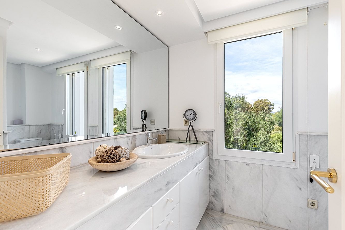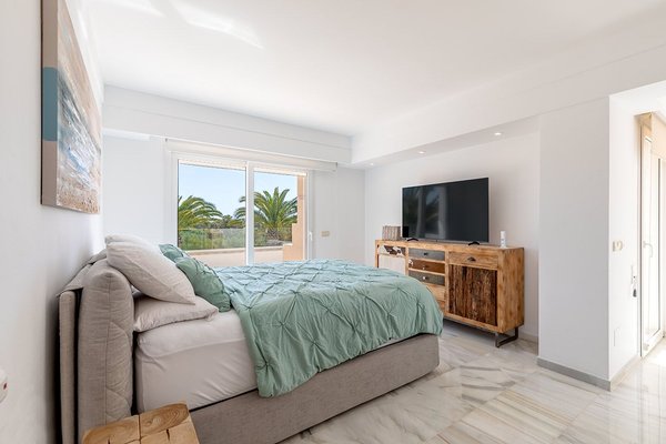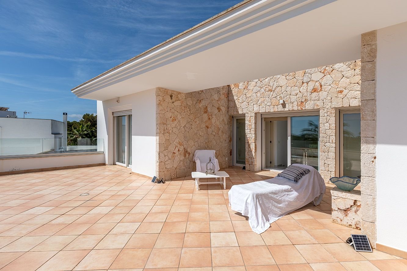 Auf dem 939 m² großen Grundstück befindet sich ein liebevoll angelegter Garten mit automatischer Bewässerung sowie ein 33 m² Pool. Die insgesamt 160 m² Terrassenflächen – zur Hälfte überdacht – bieten ein fantastisches Panorama mit kleinem Meerblick. Im Obergeschoss liegen zwei weitere Schlafzimmer, jeweils mit Bad en Suite, sowie eine großzügige Meerblickterrasse.