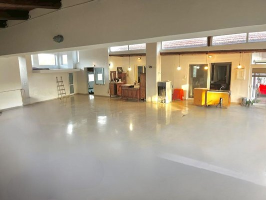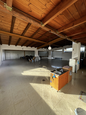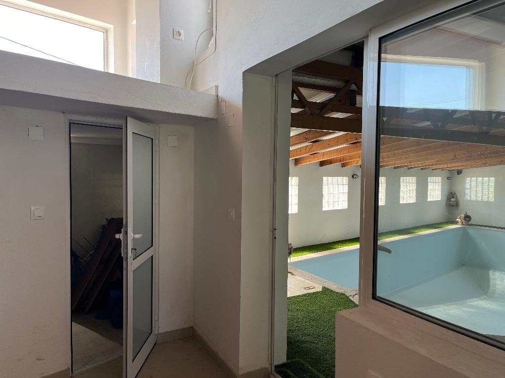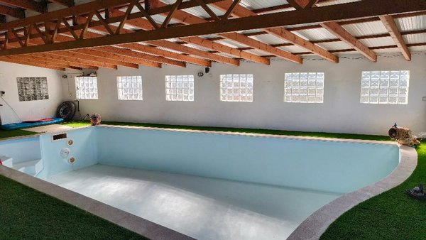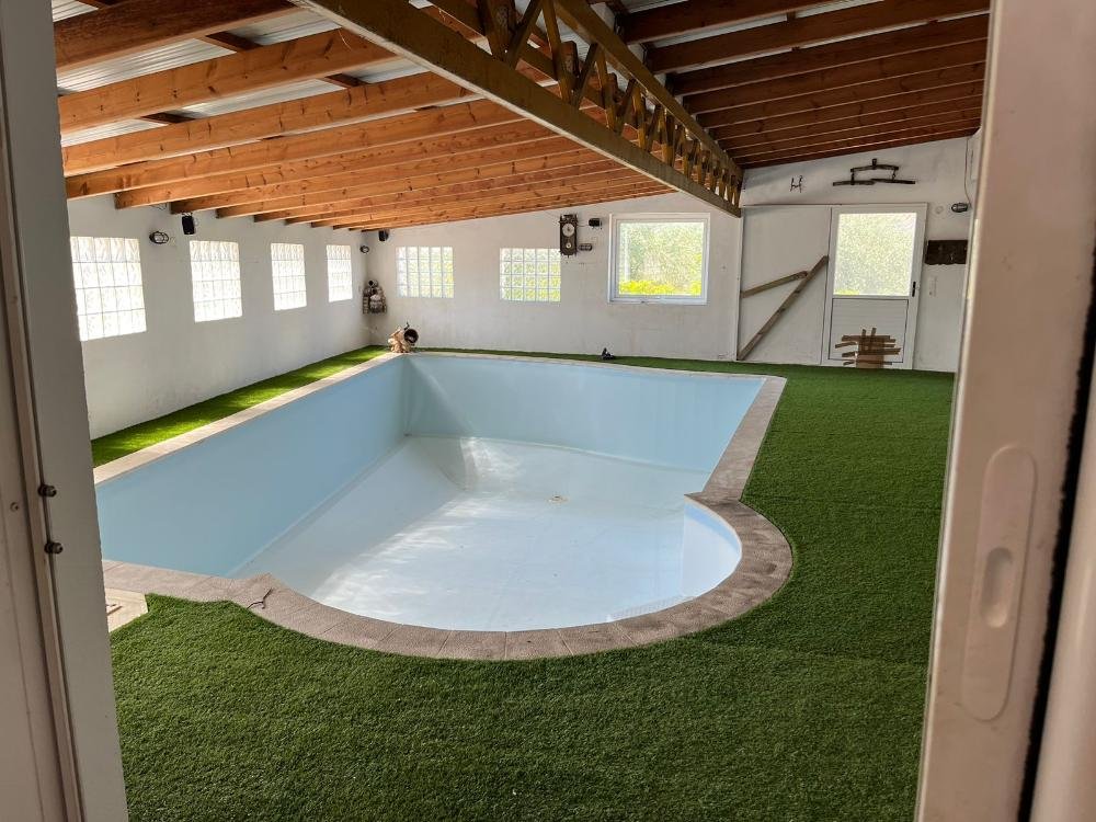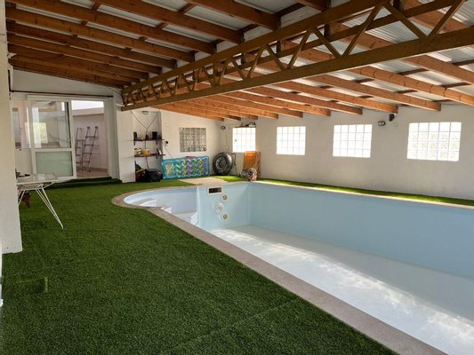 Ein Flügel dient als Garage mit Heizraum und einem vorbereiteten WC-Raum. Im anderen Flügel befindet sich ein großzügiges Hallenbad.