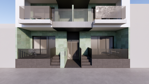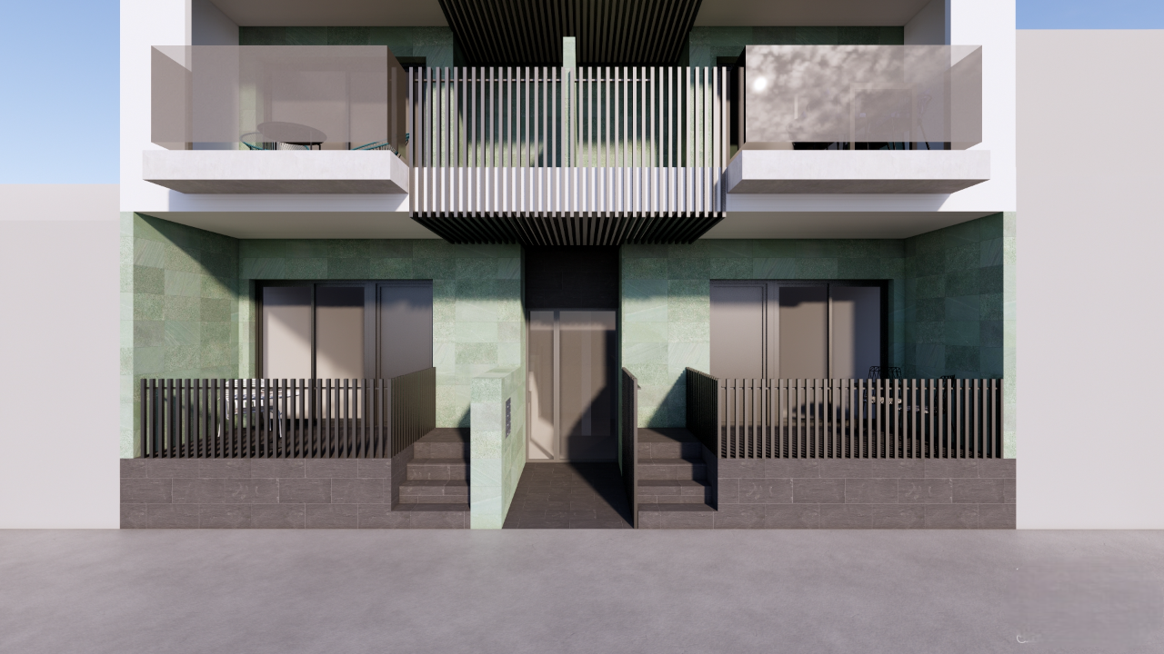 Das Apartmentgebäude verfügt über 6 innovative Apartments mit 2 Schlafzimmern im mediterranen Design, darunter eine gemeinschaftliche Dachterrasse für die Bewohner mit einem einladenden Gemeinschaftspool, einer schönen Außenküche mit zwei Elektrogrills, Tischen unter Pergolen und einer Kunstrasenfläche für Sonnenliegen zum Entspannen und Erholen am Pool. Es stehen Apartments im Erdgeschoss, im ersten Stock und im zweiten Stock zur Auswahl, alle mit einer privaten Terrasse.