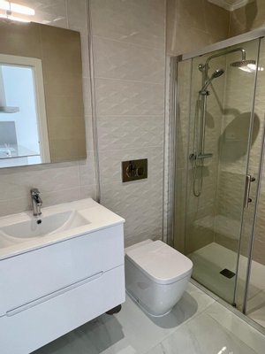 Die Villa erstreckt sich über zwei Etagen und verfügt über einen hellen und geräumigen offenen Wohn- und Essbereich mit Fenstern, die auf die Terrasse hinausgehen. Im Hauptwohnbereich befindet sich eine voll ausgestattete Küche im amerikanischen Stil in Weiß- und Grautönen mit reichlich Stauraum und Arbeitsflächen. Die Küche hat eine Tür zum hinteren Innenhof. Im Erdgeschoss befinden sich außerdem ein Doppelzimmer und ein separates Gästebad. Die Innentreppe führt Sie in den ersten Stock mit dem großen Hauptschlafzimmer, das über ein eigenes Bad und Zugang zu einer Sonnenterrasse an der Vorderseite des Grundstücks verfügt. Es gibt ein weiteres geräumiges Doppelzimmer mit eigenem Bad und Zugang zu einer privaten Sonnenterrasse auf der Rückseite des Grundstücks. Die Sonnenterrasse auf der Vorderseite des Grundstücks verfügt über eine Außentreppe, die zum Dachsolarium führt, wo Sie den ganzen Tag die Sonne genießen und den Blick auf das Meer und die Berge genießen können.