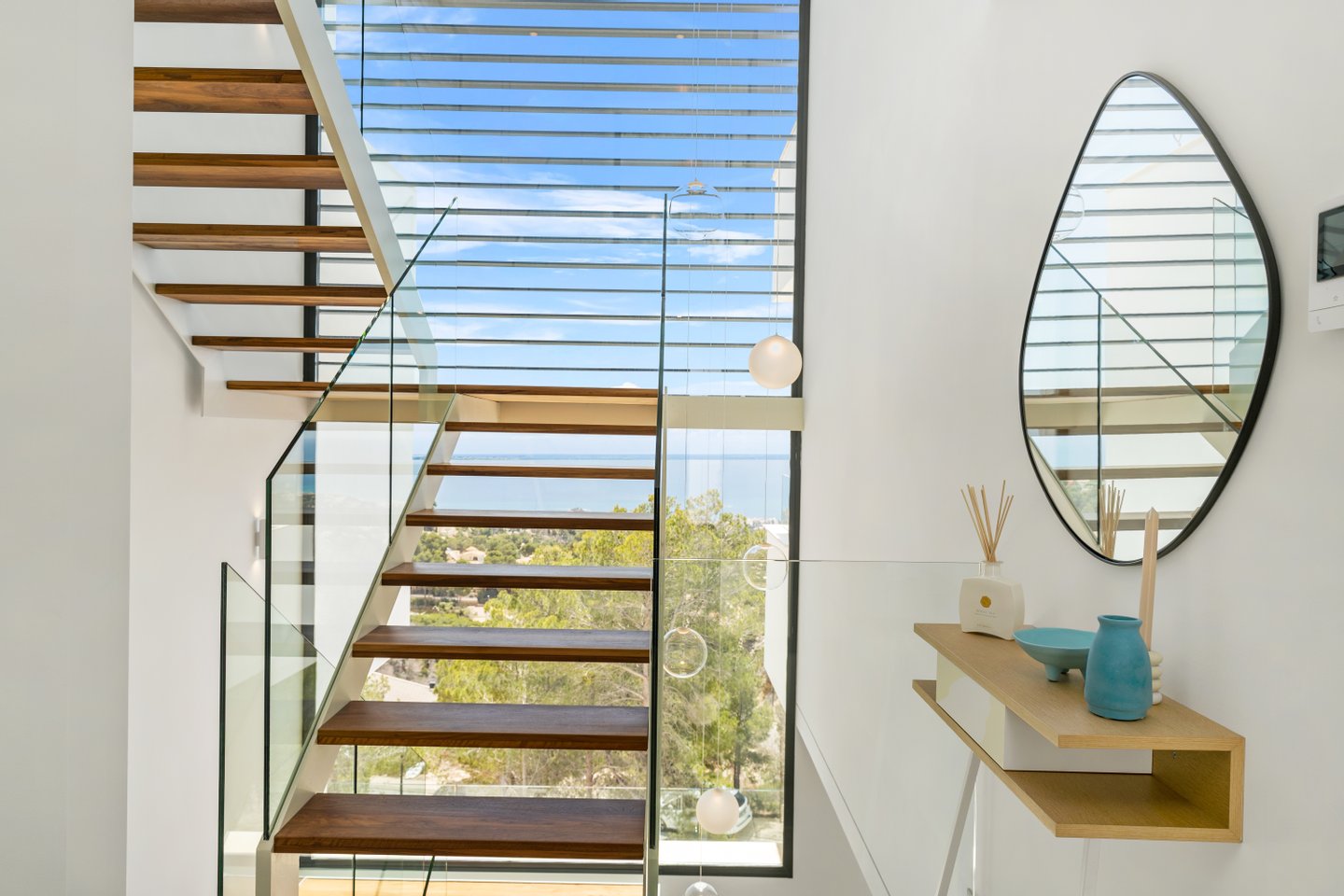 Die Villa wurde so konzipiert, dass sie in allen Bereichen ein harmonisches und fließendes Wohnerlebnis bietet. Schon beim Betreten strahlen die Innenräume Ordnung, Eleganz und Helligkeit aus. Das offene Design des Erdgeschosses verbindet Wohnzimmer, Essbereich und Küche und öffnet sich durch große Fensterflächen zum Außenbereich. Die Terrassen laden mit lauschigen Plätzchen zum Entspannen ein, und der Pool lockt zum Eintauchen in die umgebende Landschaft. Die Schlafzimmer sind gechickt verteilt und bieten nicht nur den Komfort von Einbauschränken mit Innenbeleuchtung, sondern vor allem direkten Zugang nach draußen und ungestörte Ausblicke.