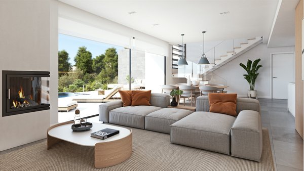 Die Villa ist auf zwei Ebenen angelegt und bietet offene, lichtdurchflutete Räume mit direkter Verbindung zum Außenbereich. Im Hauptgeschoss gehen Küche, Essbereich und Wohnzimmer fließend ineinander über und münden in eine großzügige Terrasse. Dort bilden der endlos lange Pool, die Veranda und die mediterrane Bepflanzung eine ideale Umgebung, um das milde Klima das ganze Jahr über zu genießen. Die drei geschickt verteilten, geräumigen Schlafzimmer bieten Privatsphäre und freie Sicht nach draußen.