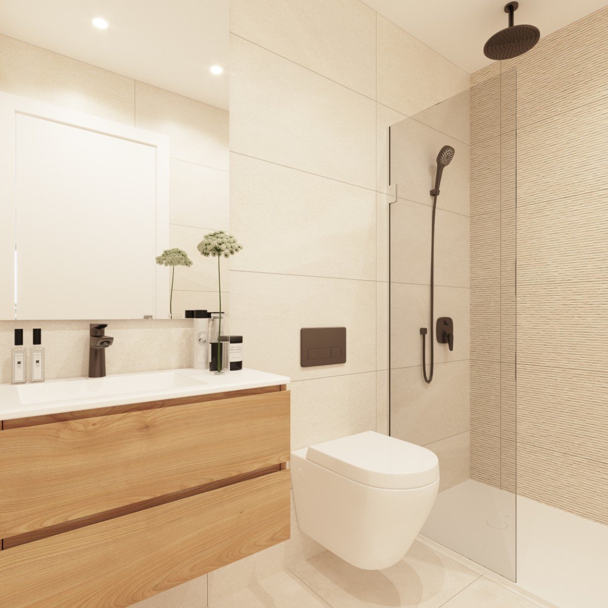 Die Innenausstattung umfasst einen hellen und geräumigen offenen Wohn- und Essbereich, der für maximales Tageslicht, Komfort und Stil ausgelegt ist und über große Fenster verfügt, die sich zur Außenterrasse hin öffnen lassen. Im Hauptwohnbereich befindet sich eine voll ausgestattete Küche im amerikanischen Stil mit einer Auswahl an Oberflächen in Mattweiß, Soft Black und Vicenza-Eiche. Das Hauptschlafzimmer verfügt über ein eigenes Bad und Terrassentüren, die sich zur Hauptterrasse hin öffnen lassen. Es gibt zwei weitere geräumige Doppelschlafzimmer (mit Terrassentüren zur hinteren Terrasse in den Wohnungen im Erdgeschoss) und ein separates, stilvolles Gästebad. Die Wohnungen im Erdgeschoss verfügen über eine großzügige Terrasse mit üppigem Garten und einen Terrassenbereich auf der Rückseite des Grundstücks. Die Wohnungen im Obergeschoss haben eine Außentreppe auf der Terrasse, die zu einer über 90 m² großen Dachterrasse mit herrlichem Ausblick führt.