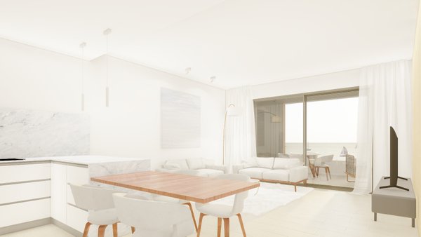 Die Innenausstattung umfasst einen Eingangsbereich, der zu einem geräumigen offenen Wohn- und Essbereich mit großen Fenstern führt, die sich zur privaten Terrasse hin öffnen. Im Hauptwohnbereich befindet sich eine voll ausgestattete moderne Küche im amerikanischen Stil mit weiß lackierten Oberflächen und Glastüren. Das große Hauptschlafzimmer verfügt über ein eigenes Bad, außerdem gibt es zwei weitere geräumige Doppelzimmer und ein separates Gästebad. Die Penthouse-Optionen mit 4 Schlafzimmern verfügen über eine Innentreppe, die in den ersten Stock führt, wo sich ein weiteres Doppelzimmer mit eigenem Bad sowie das großzügige Dachsolarium befinden, das den Außenbereich weiter vergrößert. Die Immobilien sind mit einer Vorinstallation für eine Klimaanlage, Küchengeräten (Backofen, Kochfeld, Dunstabzugshaube, Mikrowelle und Kühl-Gefrierkombination), Einbauschränken in allen Schlafzimmern und einem privaten Außenparkplatz ausgestattet.