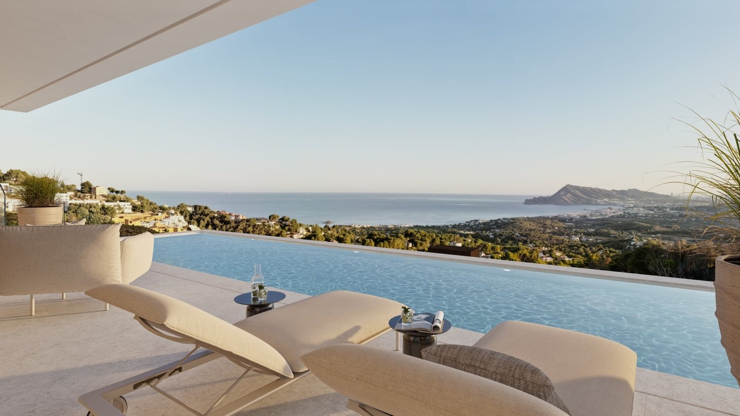 Wir präsentieren Villa Alba, eine exklusive Villa mit zeitgenössischem Design in der Wohnanlage Azure Altea Homes II in Altea (Costa Blanca Nord). Die Immobilie richtet sich an Kunden, die moderne Architektur, großzügige Raumaufteilung und Ausblicke auf das Mittelmeer suchen. Die Villa verteilt sich auf zwei Etagen und umfasst vier Schlafzimmer mit eigenem Bad, ein geräumiges Wohn-Esszimmer mit offener Küche sowie eine Hauptterrasse mit Infinity-Pool, der sich mit dem Horizont verbindet. Alle Hauptbereiche sind zum Meer ausgerichtet und haben direkten Zugang nach draußen. Es gibt eine überdachte Garage für zwei Fahrzeuge mit Vorinstallation für eine Elektro-Ladestation sowie aerothermische Systeme, Hausautomation und Solarpaneele, die Komfort und Energieeffizienz gewährleisten. Eine exklusive Immobilie mit hochwertigen Oberflächen und privilegierter Lage in Altea – ideal für Kunden, die ein bezugsfertiges Haus suchen, um den mediterranen Lebensstil mit höchster Qualität zu genießen.
