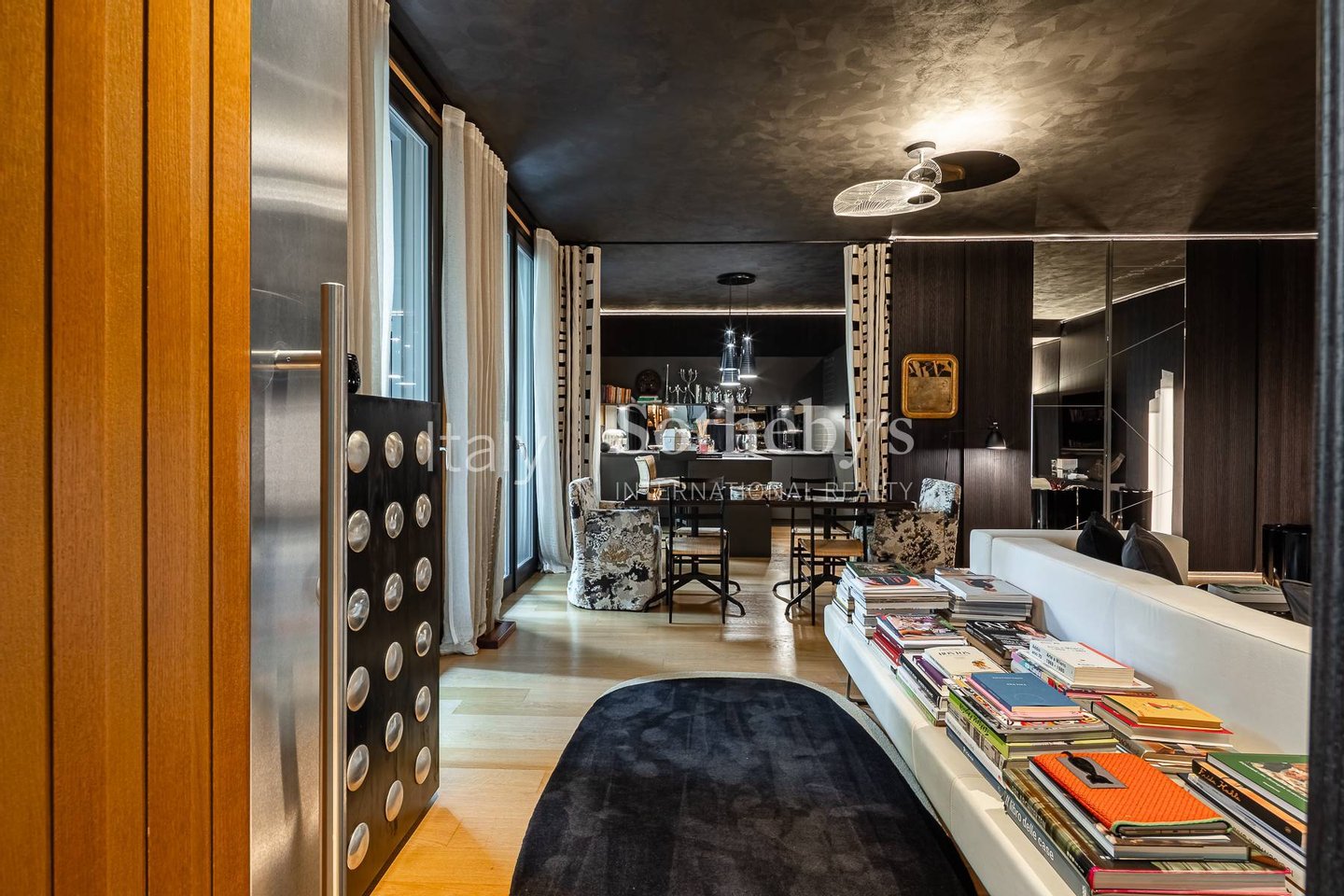 Die Wohnung, hochwertig ausgestattet und vollständig mit maßgefertigten Möbeln eingerichtet, besticht durch die gelungene Verbindung von Ästhetik und Materialqualität. Der Eingang führt direkt in einen hellen und großzügigen Wohnbereich, bestehend aus einem eleganten Wohnzimmer und einer offenen Bulthaup-Küche, ebenfalls maßgefertigt und komplett ausgestattet, die sich optisch und funktional nahtlos zu einer großen, gut nutzbaren Terrasse öffnet.